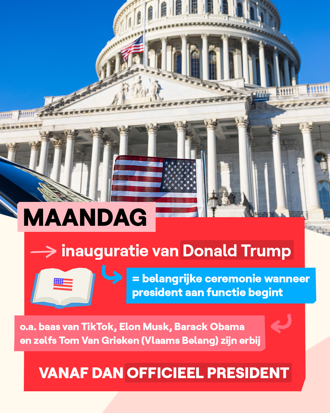 De inauguratie van Trump gaat uitzonderlijk binnen in het Capitool (in Washington D.C.) door. Dat komt omdat ze maandag extreem koud weer verwachten met gevoelstemperaturen tot zo'n -15 graden. Maar dat maakt voor veel Trump-supporters niks uit. Duizenden mensen zijn vandaag al richting het Capitool getrokken om een glimp van Trump op te vangen. In totaal zijn meer dan 25.000 agenten en militairen ingezet om alles veilig te laten verlopen.