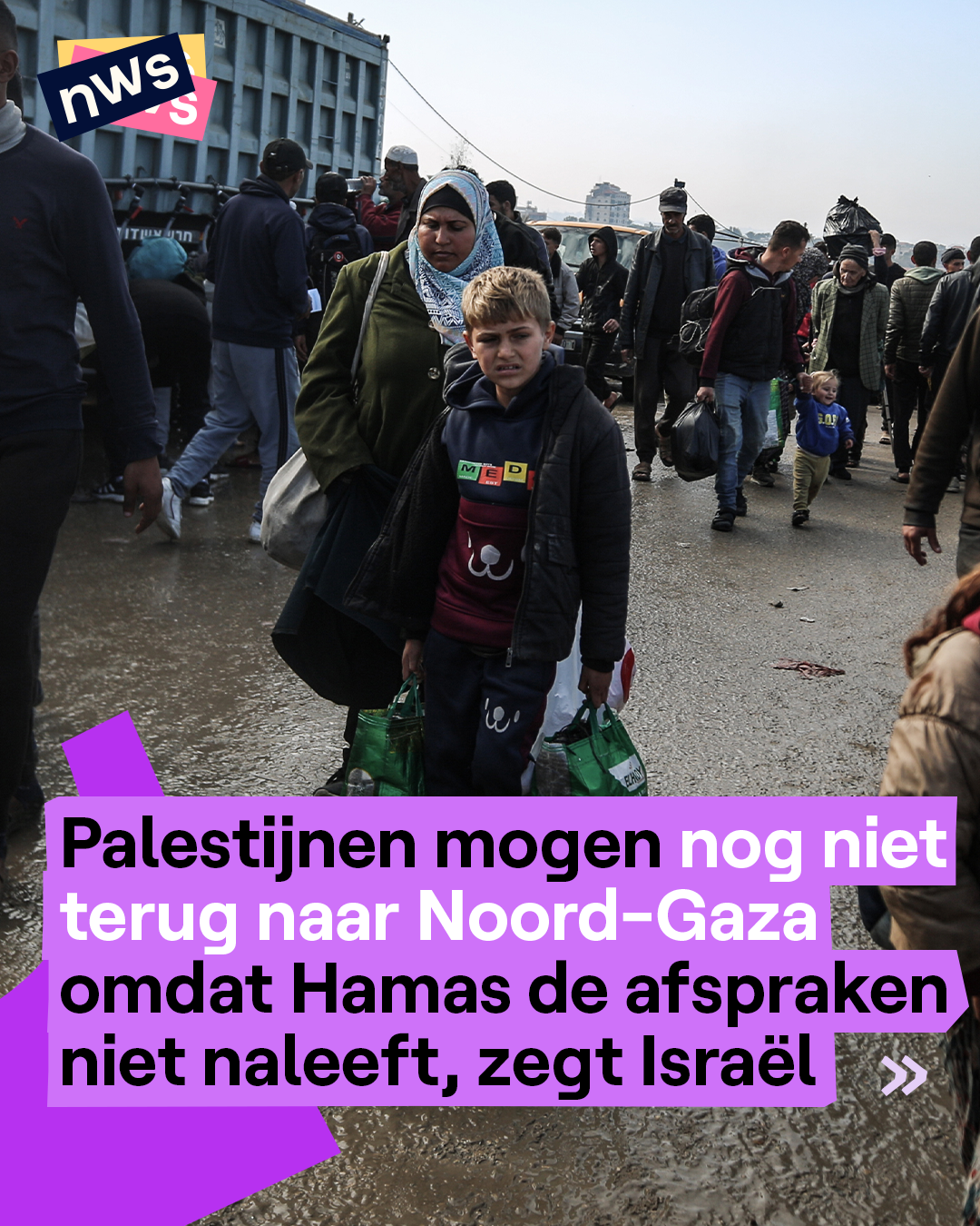 In Gaza wachten tienduizenden Palestijnen om terug te keren naar huis. Volgens de afspraken tussen Israël en Hamas, moet Israël vandaag Palestijnse burgers laten terugkeren naar Noord-Gaza. Dat gaat voorlopig niet door. Hamas heeft de regels van het staakt-het-vuren niet nageleefd, zegt Israël. Gisteren heeft Hamas 4 vrouwelijke Israëlische soldaten vrijgelaten. Volgens Israël moest ook de Israëlische Arbel Yehoud worden vrijgelaten, maar dat is niet gebeurd. De Israëlische regering liet weten dat de Palestijnen pas naar Noord-Gaza mogen terugkeren, als de vrijlating van Arbel Yehoud is geregeld. Hamas zegt dat Arbel Yehoud volgende week wordt vrijgelaten, maar daar gaat Israël niet akkoord mee.