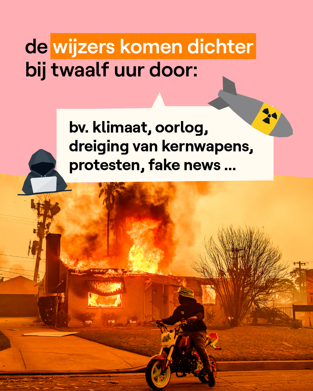 De Doemdagklok stond nog nooit zo dicht bij middernacht. We staan nu op 89 seconden voor 12 uur. Da's 1 seconde dichter dan de voorbije twee jaar. Volgens wetenschappers is de wereld er vorig jaar niet op vooruitgegaan. Dat komt onder meer door de klimaatverandering. Zo was 2024 het warmste jaar ooit gemeten. De wetenschappers maken zich ook zorgen over de oorlogen in de wereld zoals in Oekraïne en Gaza.