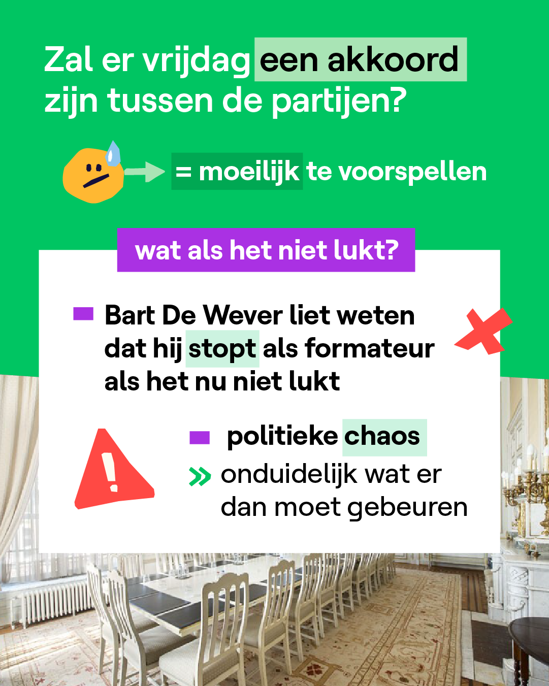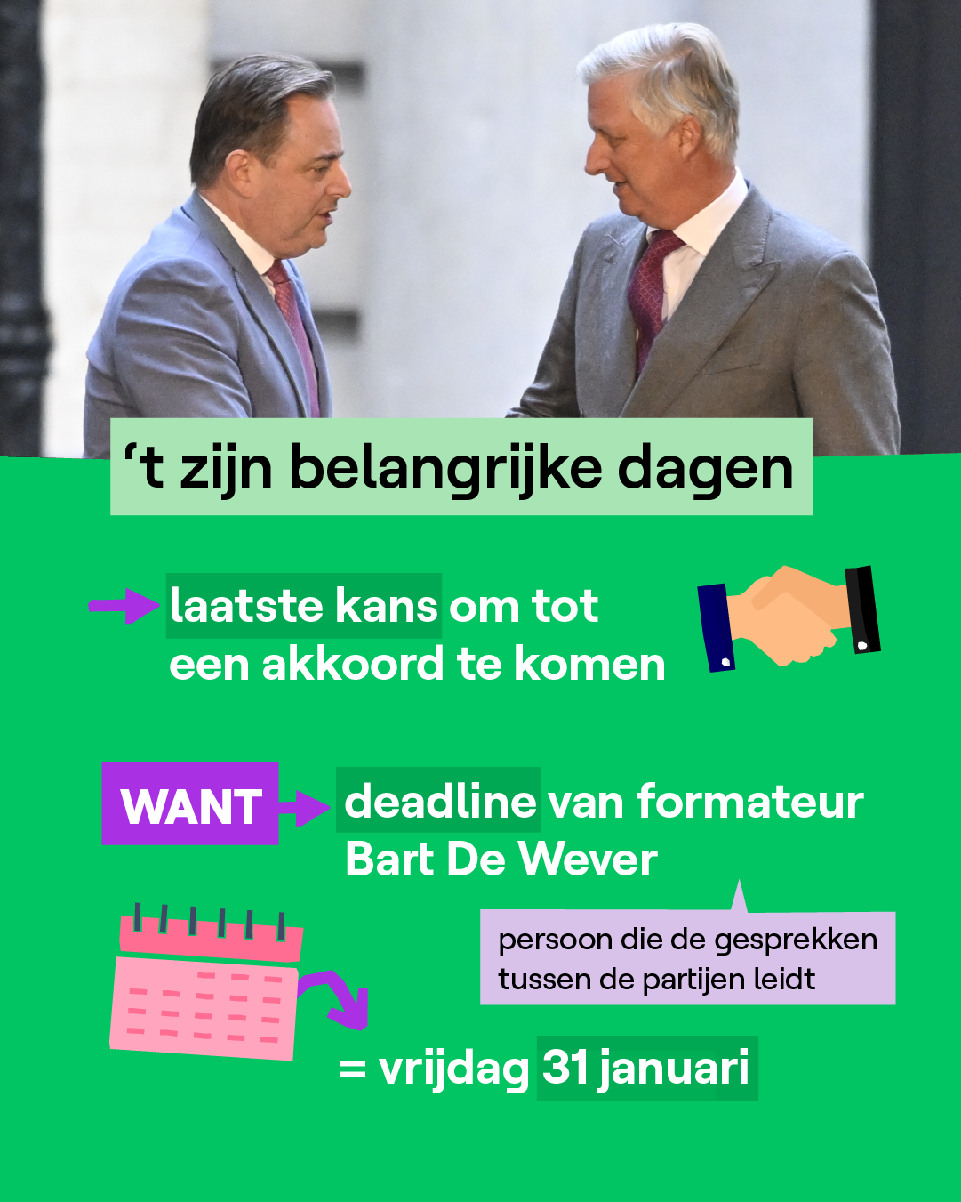 Vrijdag zal de 18e keer zijn, sinds de verkiezingen in juni, dat Bart De Wever naar de koning gaat als formateur. Deze keer zal het wel de laatste keer zijn. Ofwel wordt De Wever vrijdag premier van een nieuwe regering, ofwel neemt hij ontslag als formateur. Wat er dan zal gebeuren, is nog onduidelijk.