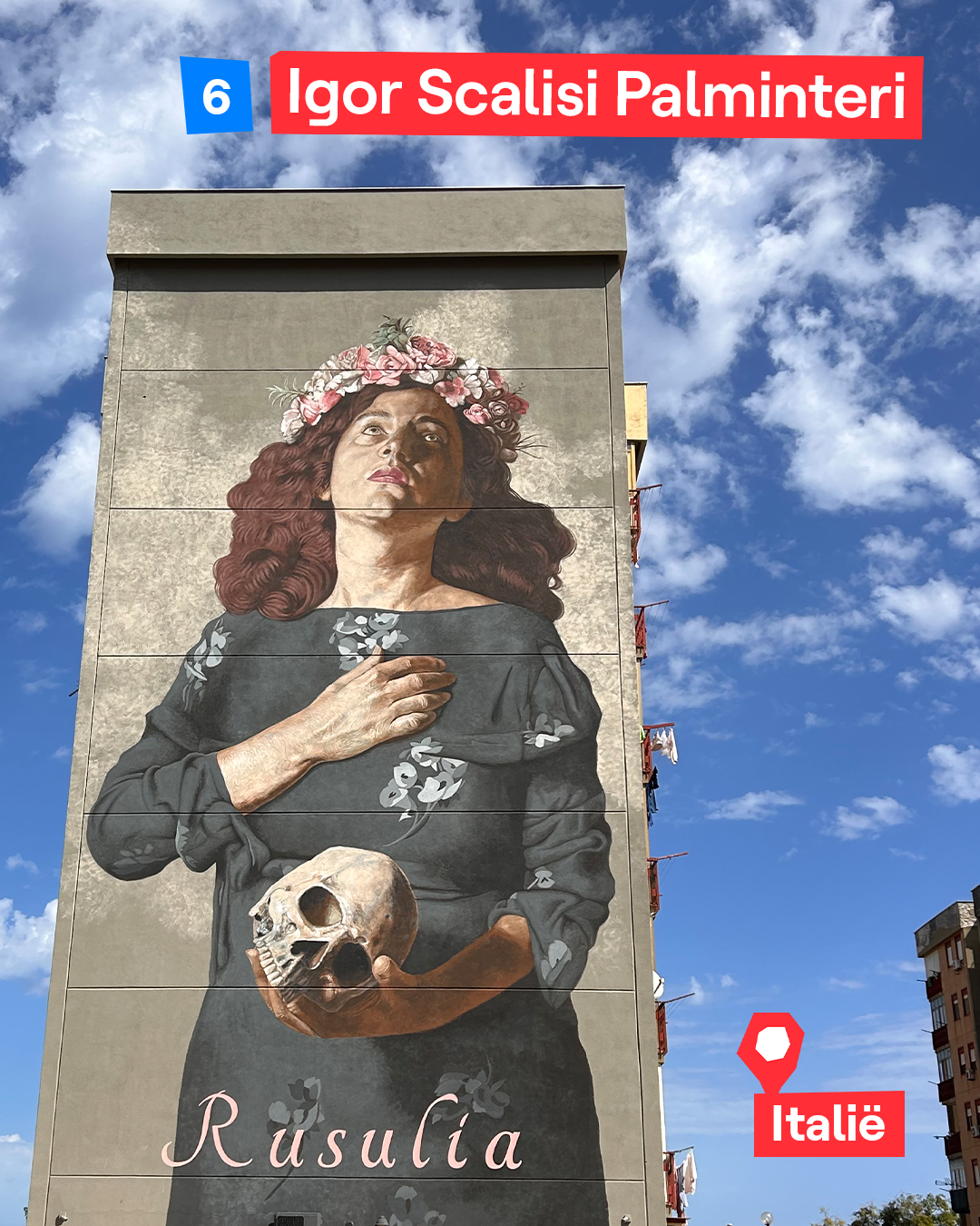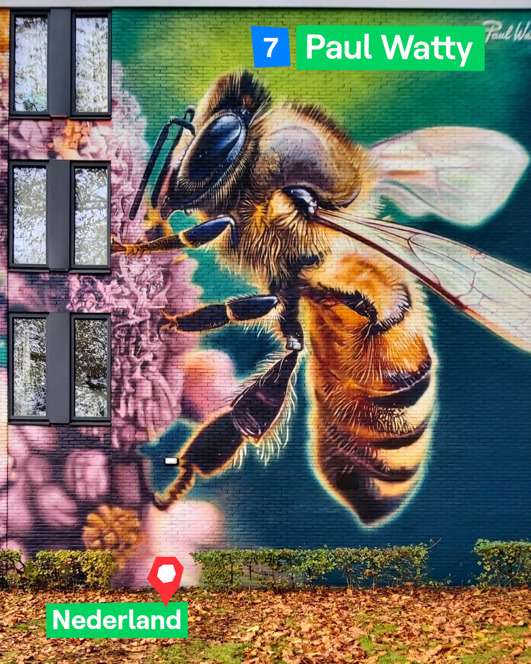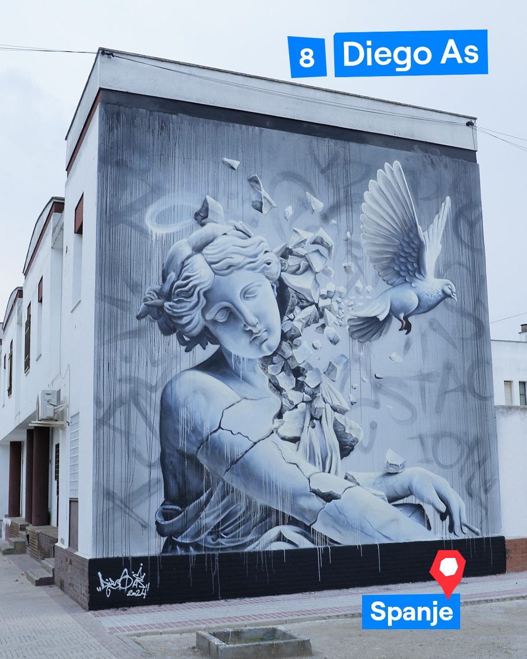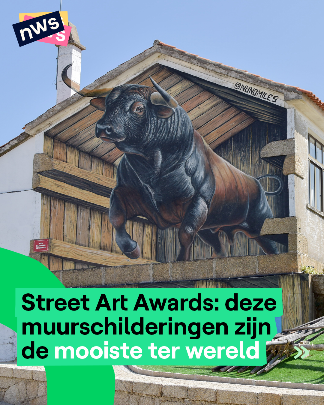 Dit kunstwerk van een stier die uit een gebouw lijkt te springen, is uitgeroepen tot de mooiste muurschildering van 2024. Het is gemaakt door artiest Nuno Miles en je kan het spotten op een huis in Portugal. Elk jaar organiseert Street Art Cities de 'Street Art Awards', een prijsuitreiking voor de mooiste straatkunst ter wereld. Meer dan 310.000 mensen stemden op hun favorieten. Benieuwd naar de top 10? Swipe!