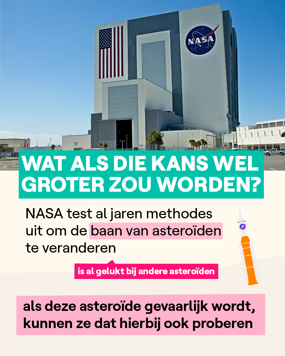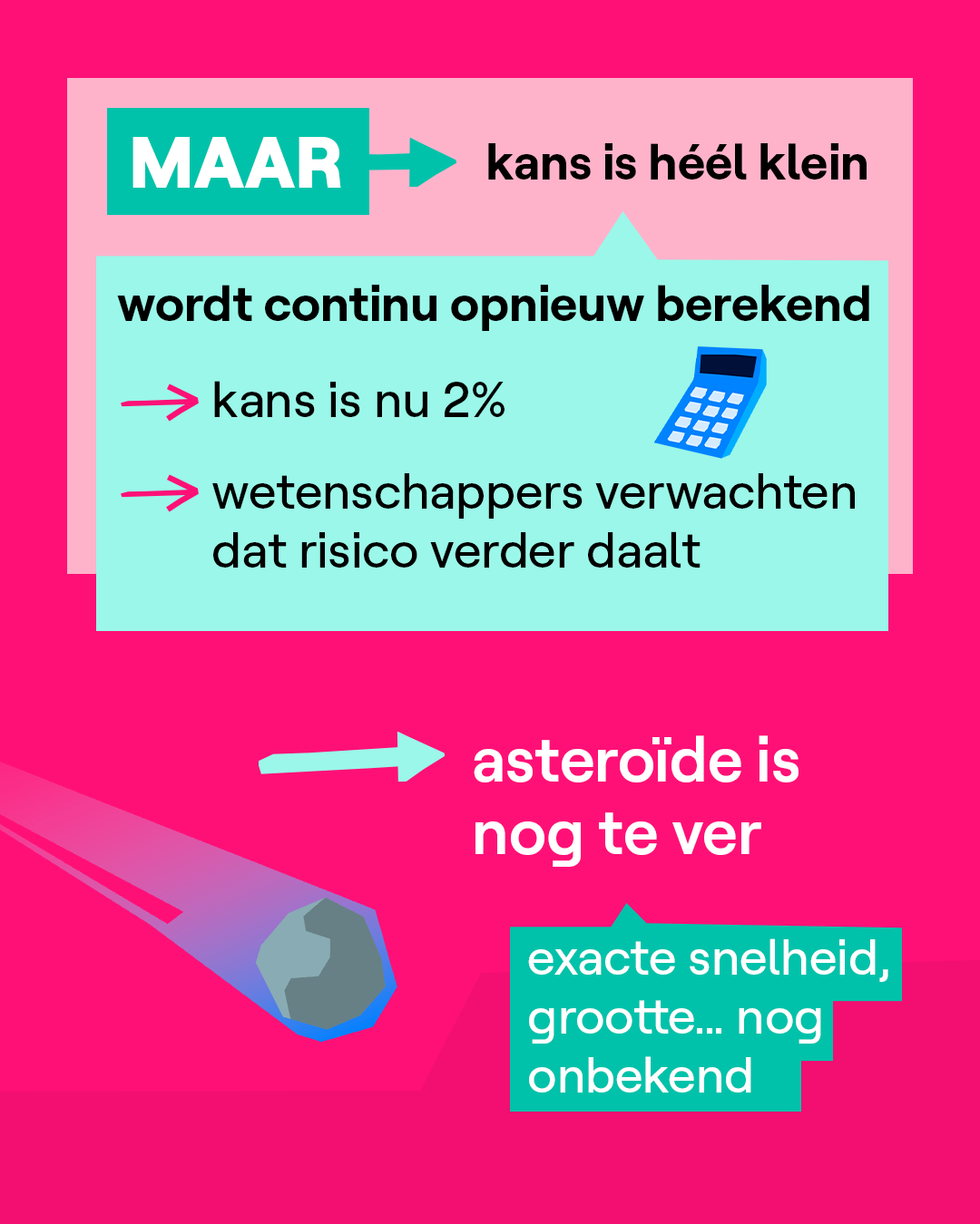 Zet jij 22/12/2032 in je agenda? Als de asteroïde inslaat, is dat volgens NASA in een zone die strekt van Zuid-Amerika tot Azië en Afrika. Met schade in een straal van 50 km. Maar de kans is heel klein. Andere asteroïden, zoals Apophis in 2004, leken eerst gevaarlijk, maar bleken uiteindelijk géén risico.