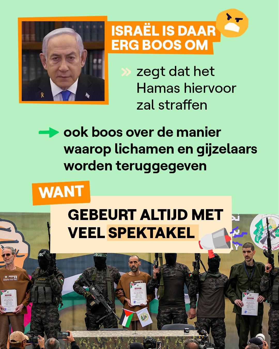 Sinds het staakt-het-vuren op 19 januari worden er elke week gijzelaars en gevangenen uitgewisseld tussen Israël en Hamas. Da's een onderdeel van de deal die toen werd gesloten. In de eerste fase zouden er 33 Israëlische gijzelaars en zo'n 1.900 Palestijnse gevangenen worden vrijgelaten. Ook werden er extra hulpgoederen toegelaten in Gaza, zoals drinkwater, voedsel en medisch materiaal. De eerste fase van de deal eindigt op 2 maart. Het is nog niet duidelijk wat er daarna zal gebeuren.