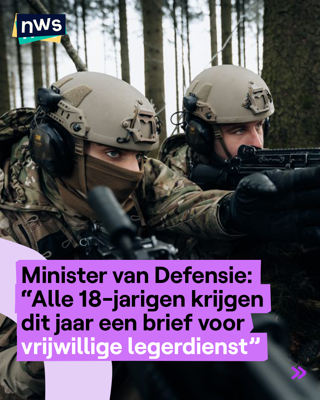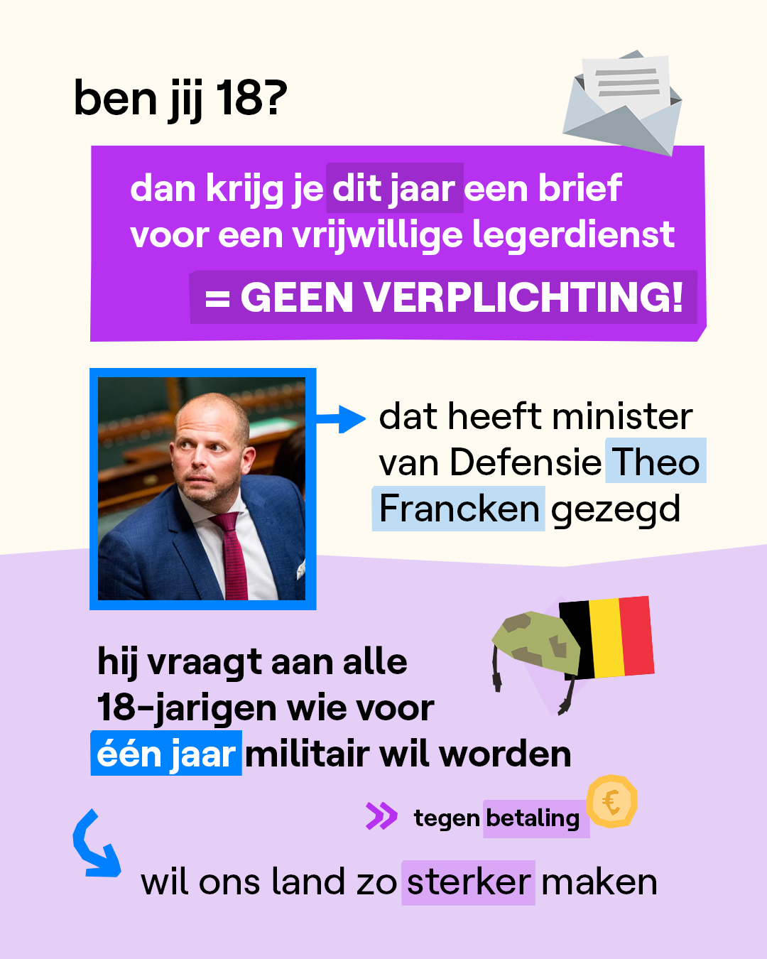 Alle 18-jarigen zullen dit jaar een uitnodiging krijgen om een vrijwillige legerdienst van één jaar te doen. De minister van Defensie Theo Francken wil de brieven zo snel mogelijk versturen, dit jaar nog. “We hebben een enorm tekort aan krachten in het leger”, zegt hij. Francken wil dat er over enkele jaren 29.000 militairen zijn. Nu zijn er zo’n 24.000. Hoeveel jongeren hierop zullen ingaan, kan de minister niet voorspellen. Voor alle duidelijkheid: de dienstplicht (een tijd verplicht in het leger zitten) wordt dus NIET opnieuw ingevoerd.