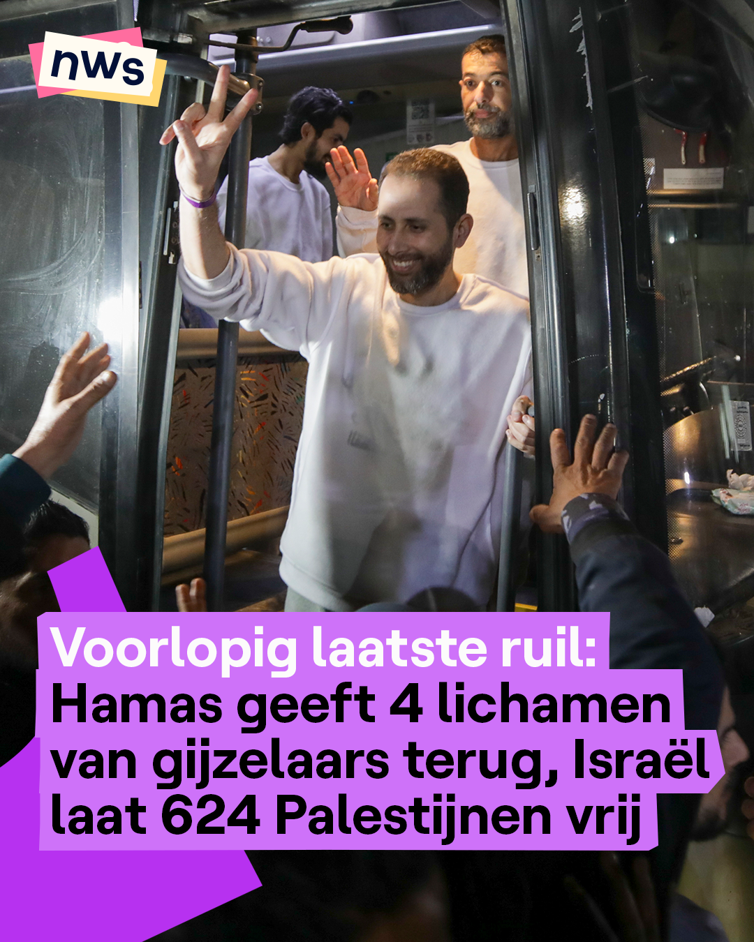 In Gaza heeft Hamas vannacht vier lichamen van overleden Israëlische gijzelaars overgedragen aan Israël. In ruil liet Israël 624 Palestijnen vrij uit Israëlische gevangenissen. Het is voorlopig de laatste keer dat er gevangenen en gijzelaars worden geruild. Dat was afgesproken in het akkoord dat Israël en Hamas sloten over een tijdelijke wapenstilstand. Na 2 maart zou de volgende fase van het akkoord moeten ingaan, maar de onderhandelingen daarover zijn nog niet begonnen. Het zou dus kunnen dat het geweld in Gaza binnenkort opnieuw losbarst. Intussen wordt er ook op de Westelijke Jordaanoever (een ander stuk Palestijns gebied) nog altijd gevochten.
