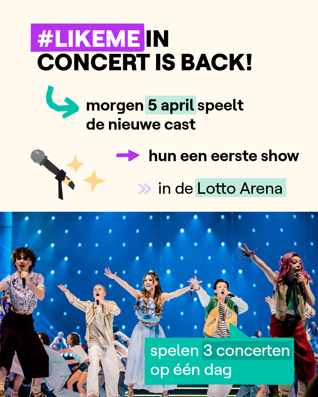 Iemand van jullie een ticketje gescoord? Morgen spelen Mia, Oscar, Louise, Jules, Raoul en Sem - de nieuwe cast van #LikeMe - hun eerste show in de Lotto Arena. Swipe voor een vibecheck!
