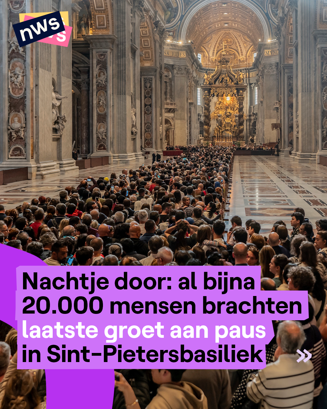 Bijna 20.000 mensen hebben gisteren een laatste groet gebracht aan de overleden paus Franciscus in de Sint-Pietersbasiliek in Rome. Zijn lichaam ligt daar sinds de ochtend opgebaard. Normaal zou de Sint-Pietersbasiliek om middernacht sluiten, maar door de lange wachtrijen besloot het Vaticaan de deuren open te houden tot 5u30. Om 7 uur vanmorgen ging de basiliek weer open. Volgens de lokale politie stonden er gisteravond nog 100.000 mensen op en rond het plein. Heel wat bezoekers moeten urenlang aanschuiven. En ook in de nacht bleven er mensen aansluiten in de rij om de paus nog een laatste keer te zien. Paus Franciscus wordt deze zaterdag begraven in zijn lievelingskerk (Santa Maria Maggiore). Vanaf dan gaan er ook 9 dagen van officiƫle rouw in.