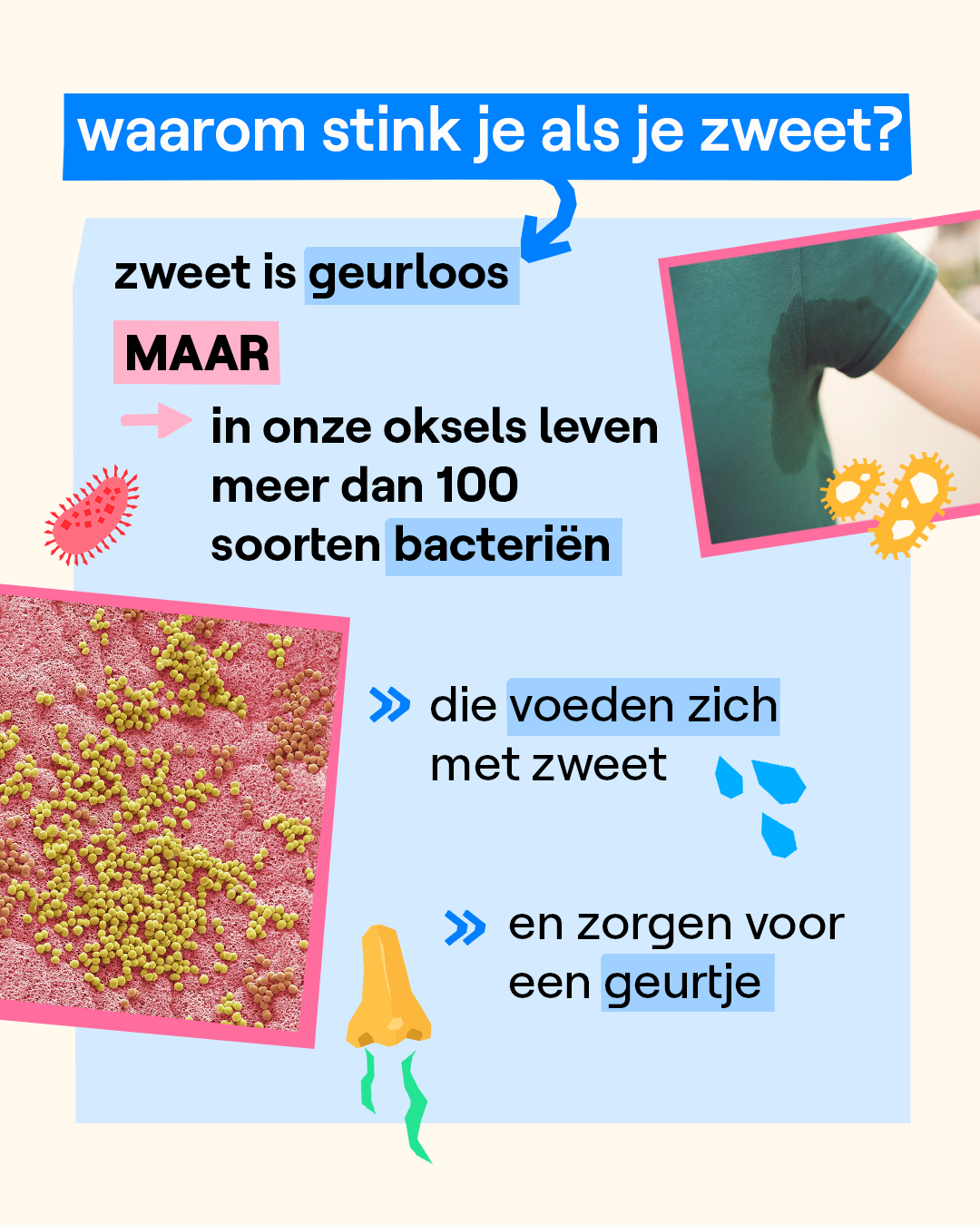 Oef! Over heel Vlaanderen wordt het vandaag warm. Van 25 graden aan de kust tot zo'n 29 graden in de rest van Vlaanderen. Zweten op zo'n warme dag is heel normaal want zo koelt je lichaam zichzelf af. Ook zorgen de zweetklieren in je oksels ervoor dat je jouw geur verspreidt.