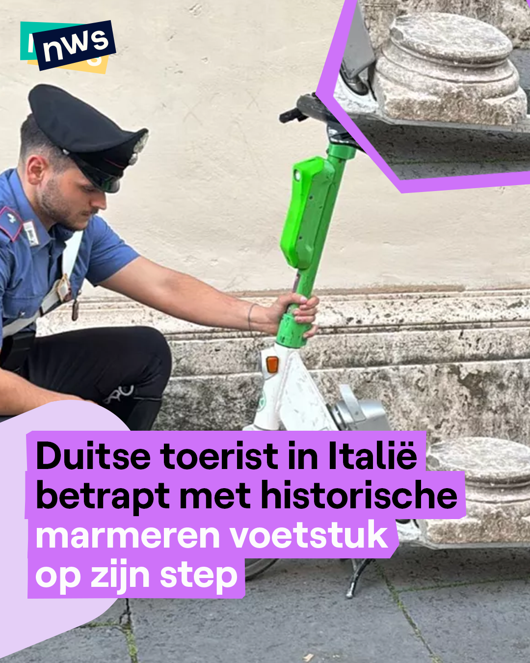 Het was een bijzonder beeld voor de Italiaanse politie in Rome. Een toerist met een marmeren voetstuk van 30 kg op zijn step. Het voetstuk was deel van een historische Romeinse zuil. De 24-jarige Duitser zag het voetstuk als een soevenir. Maar daar denkt de Italiaanse politie toch anders over. Volgens hen gaat het om een historisch belangrijk stuk. Waar het precies vandaan komt, wordt nog onderzocht. Er loopt momenteel ook een onderzoek tegen de toerist voor het stelen van culturele goederen.
