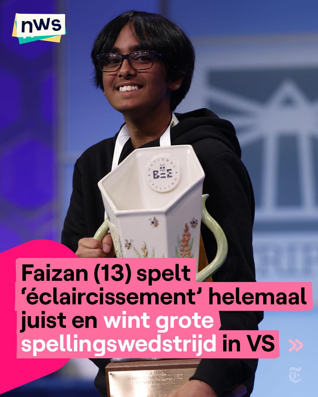 En français s'il vous plait! De 13-jarige Faizan uit Texas (VS) heeft gisteravond de 100ste editie van de Scripps National Spelling Bee gewonnen. Da's de grootste spellingswedstrijd voor tieners in de VS. Faizan spelde in de elfde ronde van de finale het Franse woord 'éclaircissement' (= 'verduidelijking') helemaal juist, zonder een seconde te twijfelen. Hij scoorde zo meer punten dan de andere 8 finalisten en wint naast een giga-trofee meer dan 50.000 dollar in cash en andere prijzen. Spellingswedstrijden zijn superpopulair in de VS. Ze krijgen veel media-aandacht en elk jaar doen miljoenen leerlingen mee aan lokale en nationale competities.