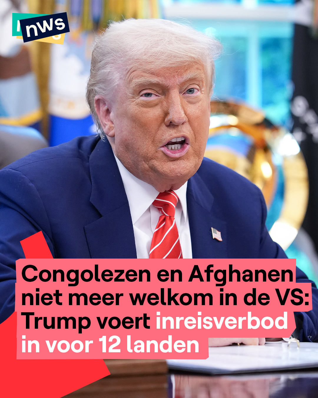 De Amerikaanse president Donald Trump kondigt een inreisverbod aan voor mensen uit 12 landen. Inwoners uit onder andere Afghanistan, Congo, Haïti, Iran en Jemen mogen vanaf volgende week (9 juni) niet meer naar de VS reizen. Het gaat dus vooral om landen uit het Midden-Oosten en Afrika. Trump zegt dat hij op die manier de VS wil beschermen tegen “buitenlandse terroristen”. Hij zegt dat de lijst van landen kan veranderen als de situatie ergens verbetert. Maar er kunnen ook landen bijkomen als er volgens hem een nieuwe dreiging is.