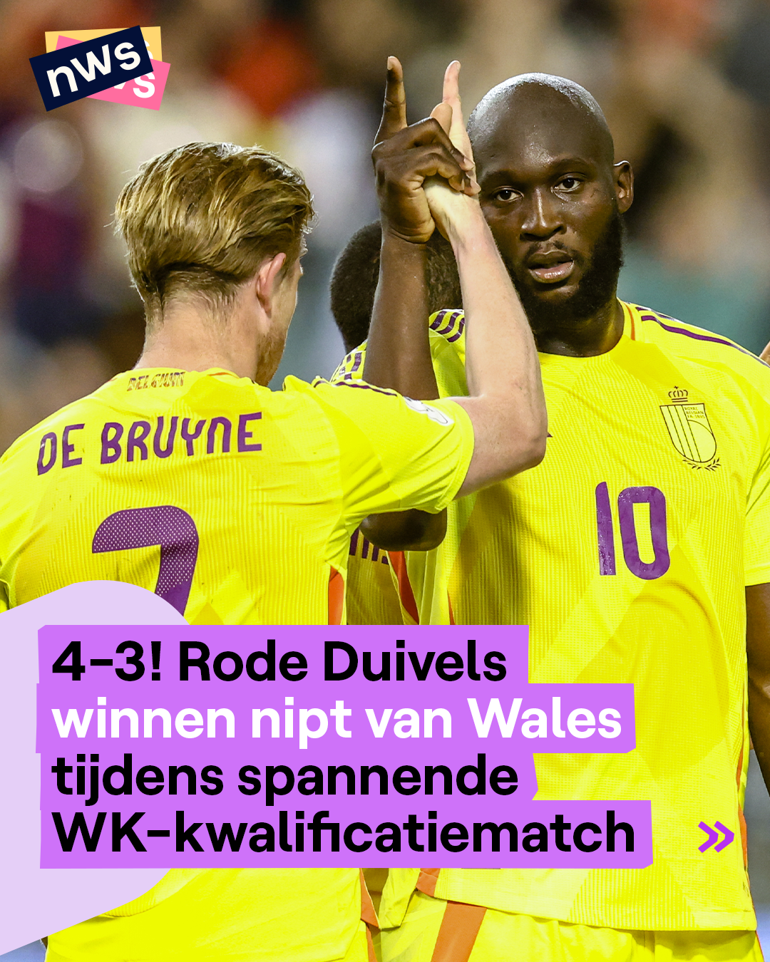 Wat een match! In Brussel hebben de Rode Duivels gisteravond hun tweede kwalificatiematch voor het WK gewonnen. Ze versloegen Wales met 4-3, maar die overwinning was niet zo gemakkelijk. De Rode Duivels scoorden in de eerste helft 3 keer, maar die voorsprong verdween helemaal toen Wales in de tweede helft ook 3 goals kon maken. Pas in de allerlaatste minuten van de wedstrijd scoorde Kevin De Bruyne nog eens, goed voor 4-3. Om volgend jaar mee te doen aan het WK, moet België groepswinnaar worden. Voorlopig staan de Rode Duivels op de derde plaats in hun groep, maar ze hebben voorlopig nog 2 wedstrijden minder gespeeld dan de andere landen.