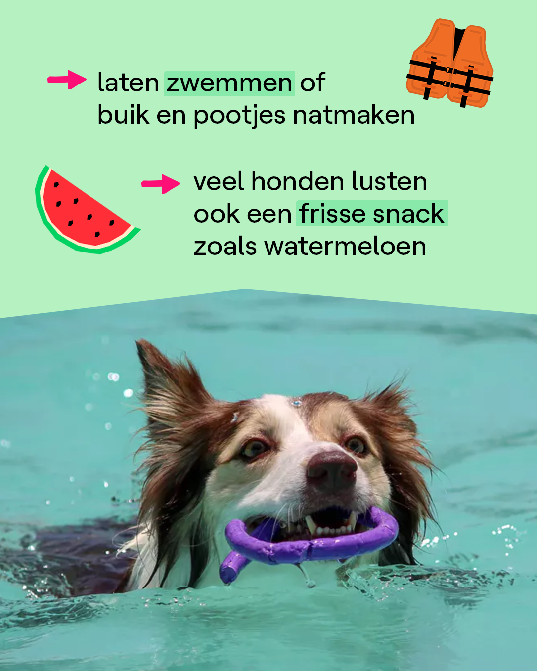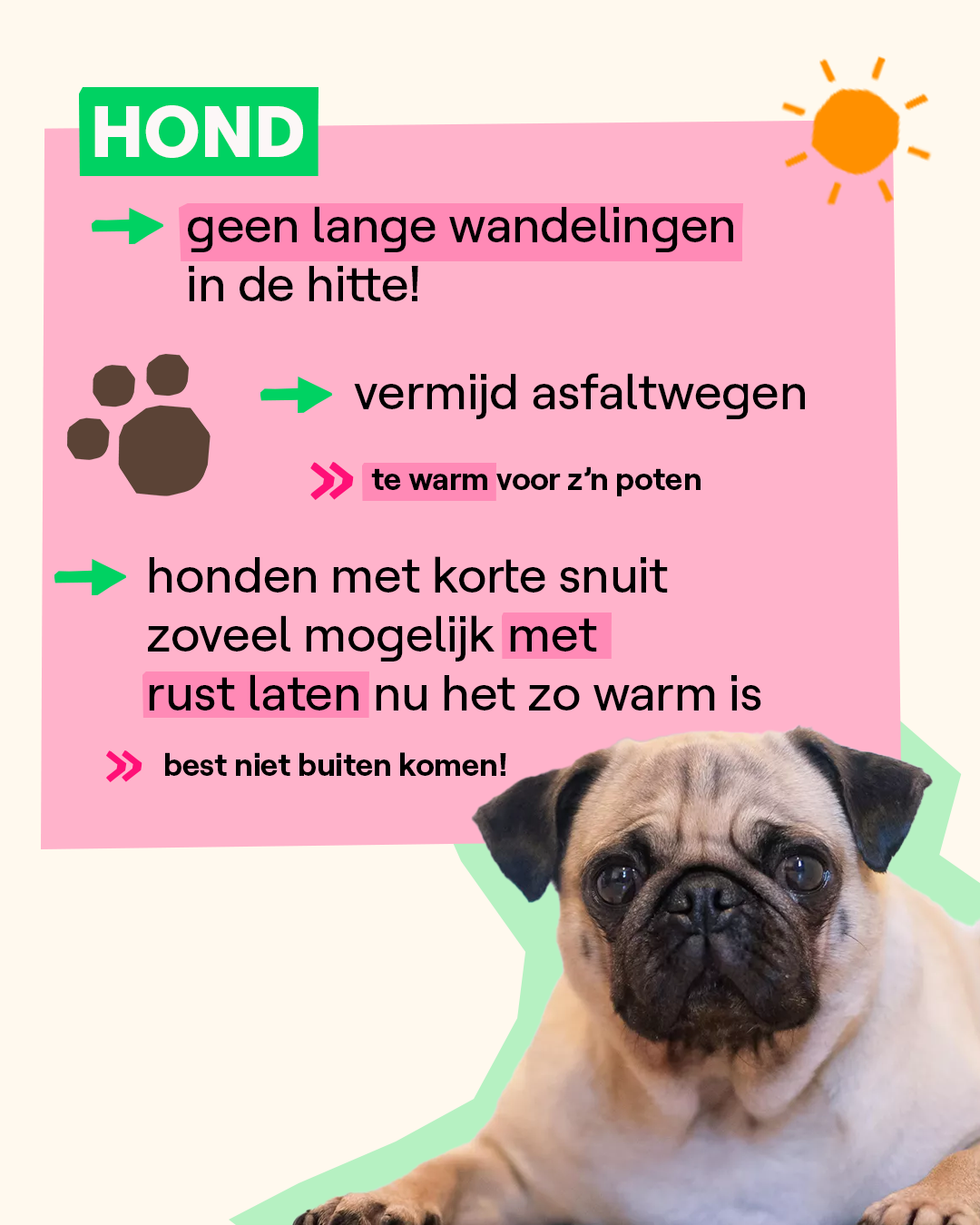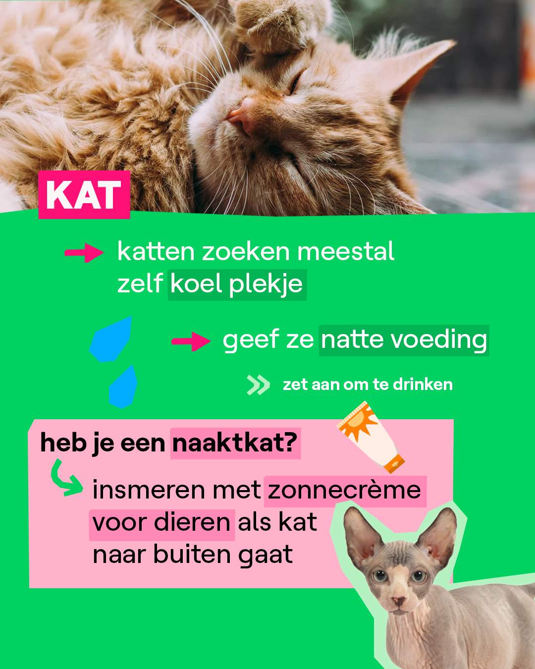Net zoals ons hebben ook onze huisdieren last van de warmte. Vooral kortsnuitige honden en katten lijden het meest onder hoge temperaturen. Zij kunnen de warmte minder goed kwijtgeraken door hun korte snuit. Probeer ze dus tussen 11 uur en 18 uur zeker binnen te houden. Behalve voor een plasje natuurlijk.