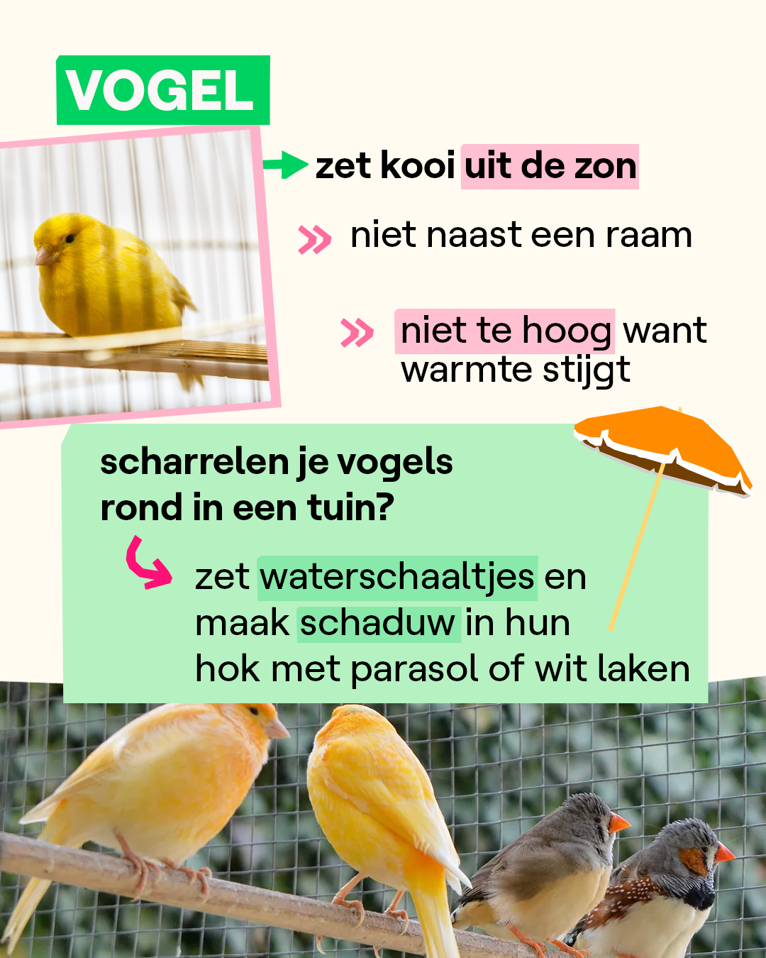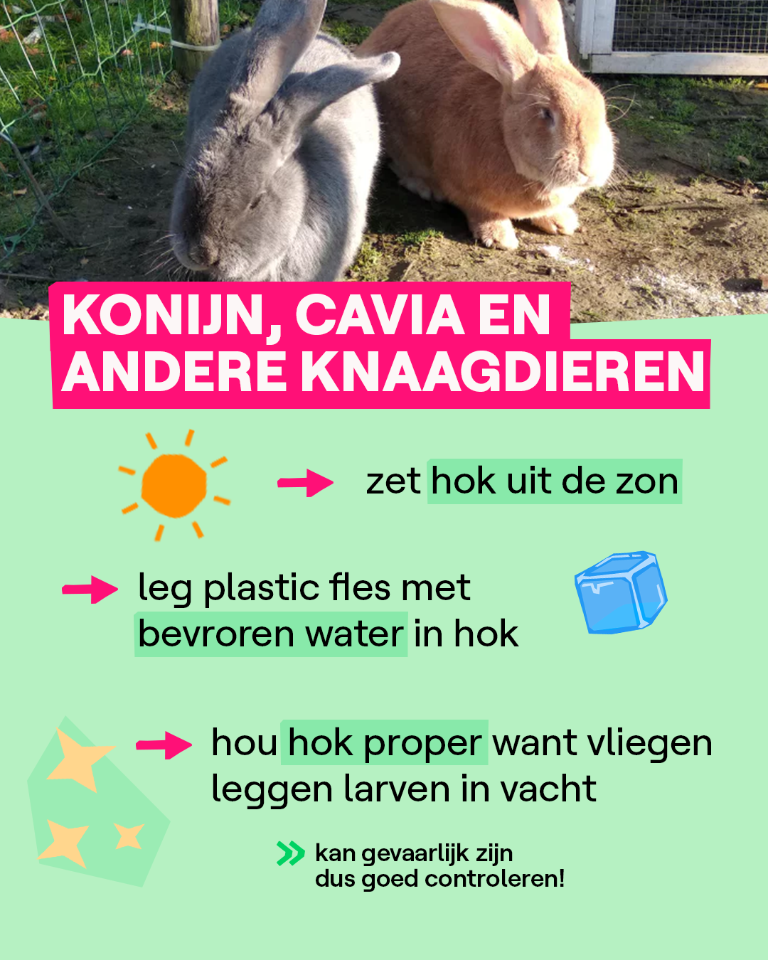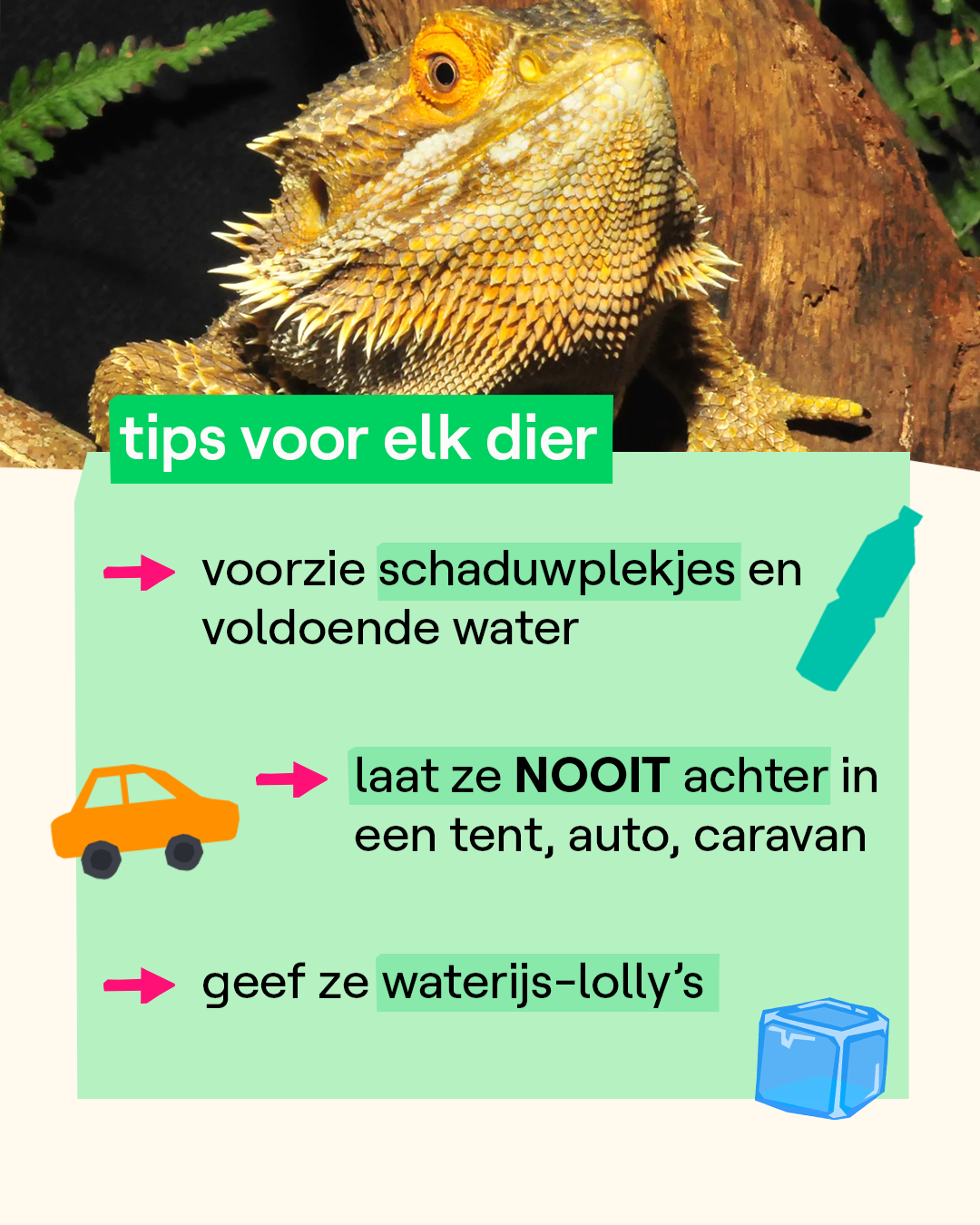 Net zoals ons hebben ook onze huisdieren last van de warmte. Vooral kortsnuitige honden en katten lijden het meest onder hoge temperaturen. Zij kunnen de warmte minder goed kwijtgeraken door hun korte snuit. Probeer ze dus tussen 11 uur en 18 uur zeker binnen te houden. Behalve voor een plasje natuurlijk.