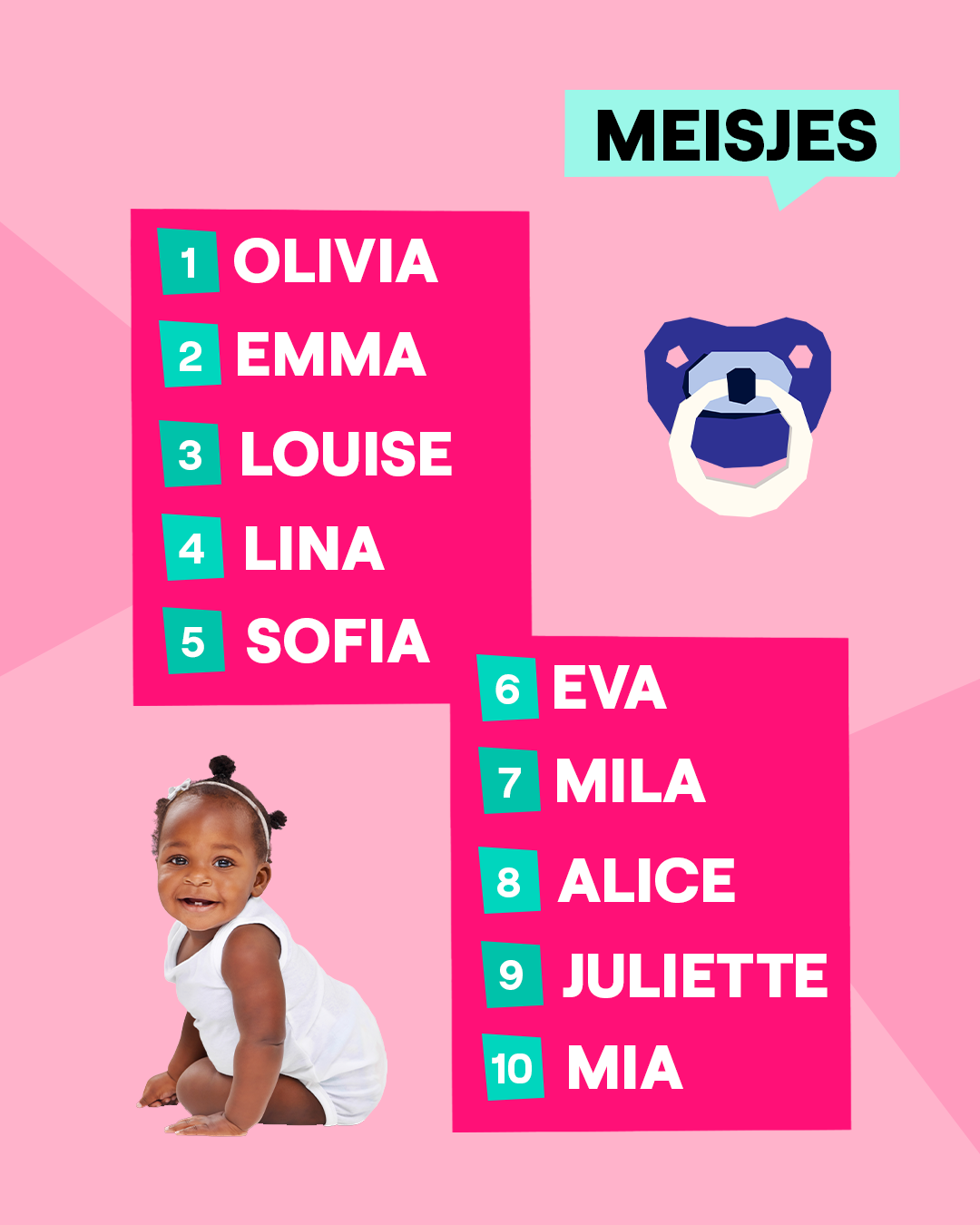 De kans is heel groot dat jij niet 1, maar 10 Olivia's of Noahs kent. Want voor de zoveelste keer zijn dat de populairste voornamen voor baby's in België. Olivia staat al sinds 2019 op nummer 1. In 2024 zijn er maar liefst 531 geboren. Bij de jongens scoort Noah hoog sinds 2021. Vorig jaar kregen 582 baby's die naam. Opvallend: in beide lijsten is er maar 1 nieuwe naam in de top 10. Bij de meisjes is dat Mia en bij de jongens is Leon steeds populairder. Daardoor zijn Anna en Matteo uit de top 10 verdwenen. Over de hele bevolking blijven Maria en Marc nog altijd de meest voorkomende namen in België. Bij de familienamen blijven Peeters, Janssens en Maes de toppers. Benieuwd hoeveel Belgen rondlopen met jouw voornaam? Check dan zeker de website van Statbel. Zij verzamelen alle statistieken van ons land.
