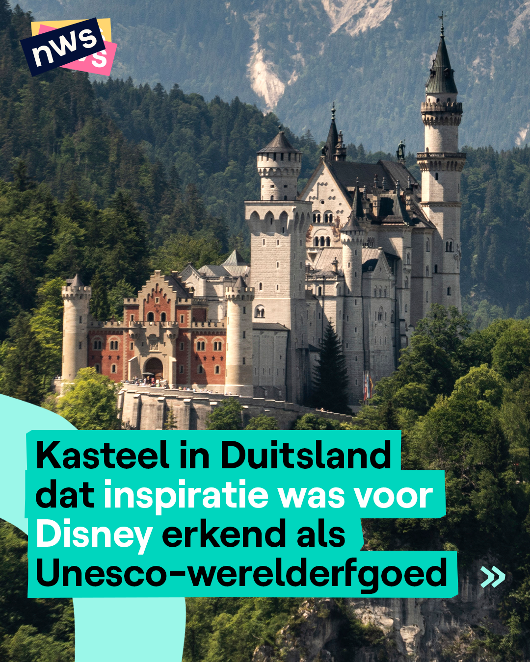 Zie jij de gelijkenis? Het kasteel van Neuschwanstein staat vanaf nu op Unesco-werelderfgoedlijst. Da's een lijst met bijzondere plaatsen, feesten en tradities die wereldwijd beschermd moeten worden. Het kasteel ligt in de Duitse deelstaat Beieren en werd gebouwd in de 19e eeuw voor een Duitse koning. Misschien herken je het kasteel wel want het was de inspiratie voor het beroemde kasteel van Doornroosje in Disneyland. In totaal zijn er tientallen nieuwe plaatsen erkend al werelderfgoed. Naast Neuschwanstein staan er nog 3 kastelen uit Beieren op de lijst.
