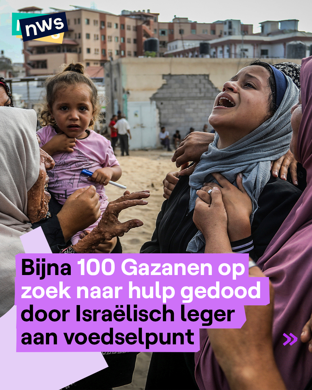 In Gaza werden gisteren bijna 100 mensen gedood aan een voedselhulppost. Honderden Gazanen stonden van 's ochtends vroeg in de rij om een maaltijd te bemachtigen. Ze werden doodgeschoten door Israëlische soldaten die zich naar eigen zeggen bedreigd voelden. Er vielen volgens lokale bronnen ook meer dan 100 gewonden. Veel mensen werden met schotwonden naar het ziekenhuis gebracht, maar daar is nog enkel plaats op de vloer. Sinds mei werden al zeker 900 Gazanen gedood die op zoek waren naar hulp bij voedselposten, zegt het Gazaanse ministerie van Volksgezondheid.