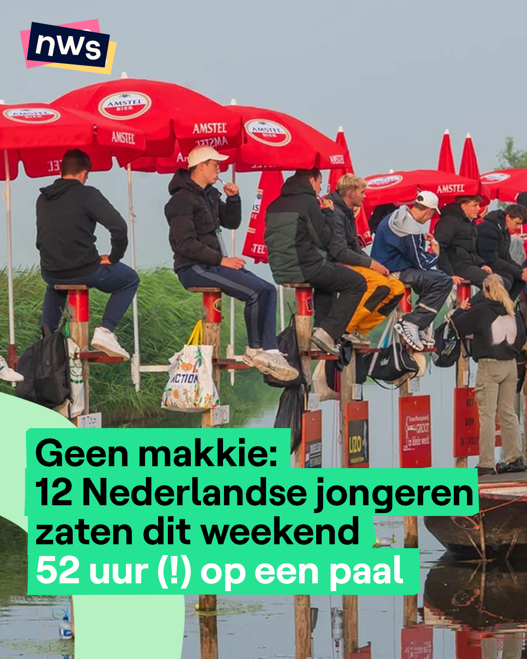 En hoe was jouw weekend? Deze 12 Nederlandse tieners zaten 52 uur (!) en 38 minuten op een paal. Ze deden mee aan de jaarlijkse traditie paalzitten in het dorpje Lambertschaag. Mentaal en fysiek geen 'makkie', want je kan niet slapen en je moet dagenlang in dezelfde positie zitten. Je mag wel naar de wc, maar dat gaat van je zittijd af. Daarom plassen de meeste deelnemers in een buis. Wie het paalzitten kan volhouden tot het einde, gaat naar huis met een som geld en eeuwige roem. Alle twaalf deelnemers hebben het dit jaar tot het einde volgehouden.
