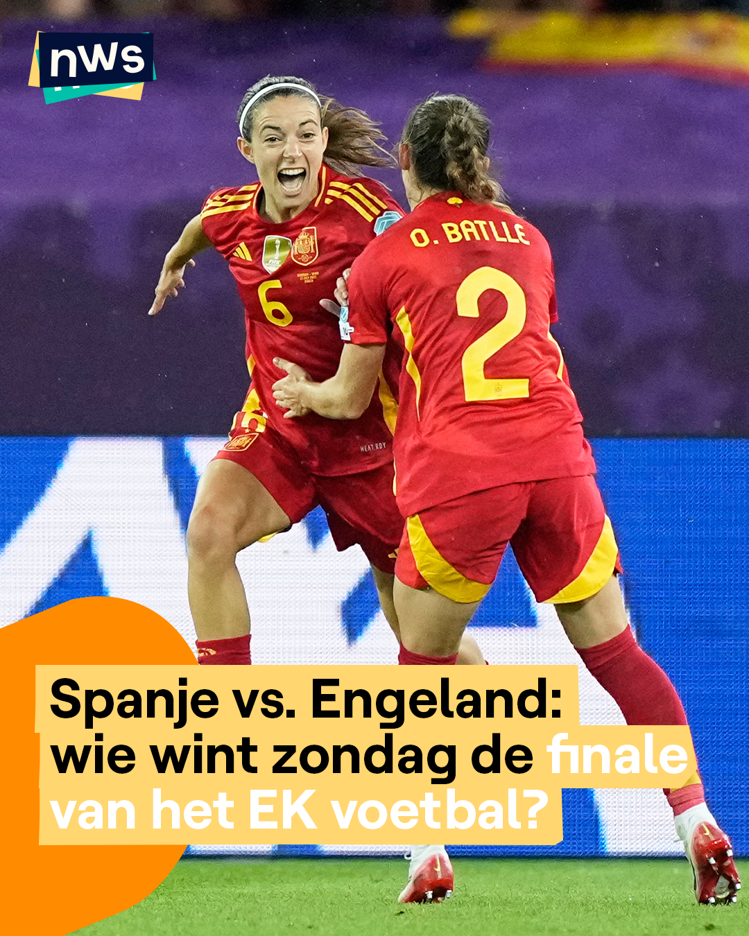 't Is beslist! Zondag strijden Spanje en Engeland tegen elkaar in de finale van het EK voetbal voor vrouwen. Gisteravond won Spanje na een spannende match van Duitsland met 1-0 in de verlengingen. En zo staat Spanje voor de allereerste keer ooit in de finale van een EK. Ze zijn ook de grote favoriet om het toernooi te winnen, want twee jaar geleden wonnen ze nog het WK. Engeland speelt al voor de tiende keer (!) mee in een EK-finale.