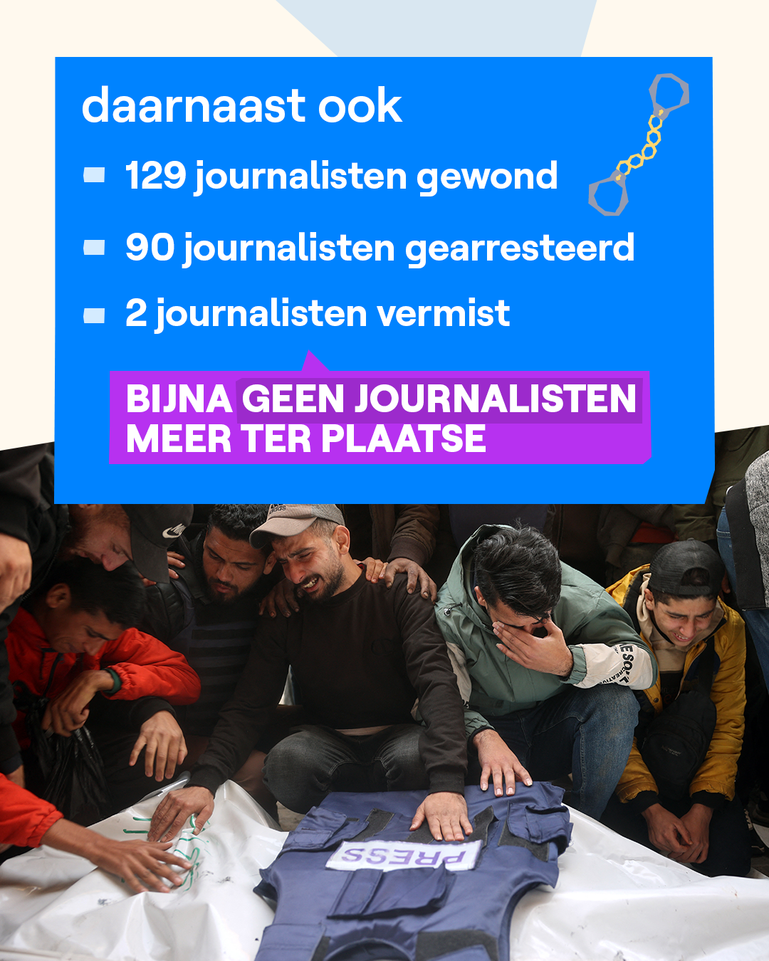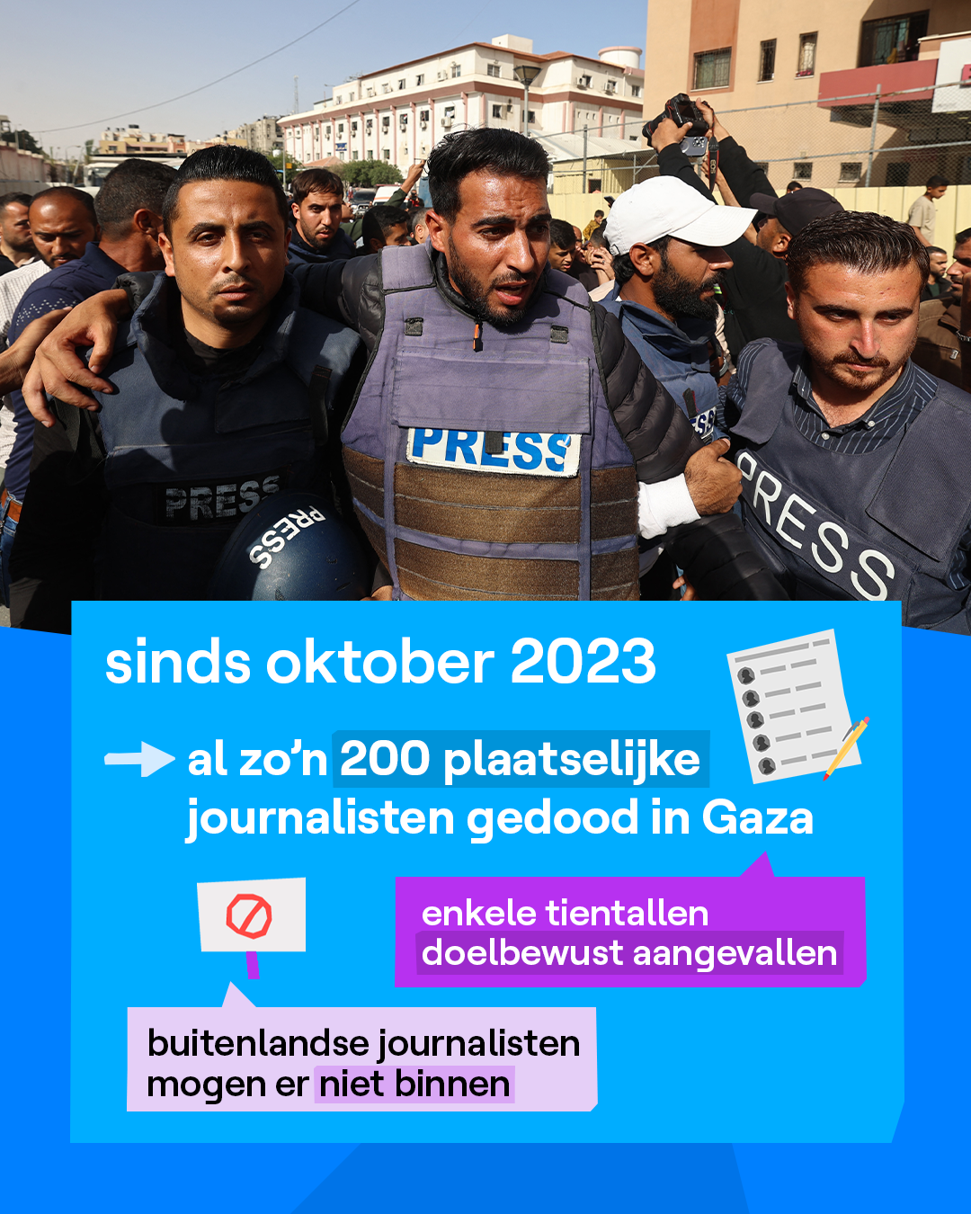 De oorlog in Gaza is het dodelijkste conflict voor journalisten ooit. Tijdens de Tweede Wereldoorlog werden er in totaal 69 journalisten gedood. In de oorlog tussen Rusland en Oekraïne werden sinds februari 2022 19 journalisten gedood. Samen met heel wat andere organisaties ondertekende VRT NWS een verklaring van het Internationaal Instituut voor de Veiligheid van Nieuws. Daarin wordt er gevraagd dat journalisten in Gaza hun werk veilig kunnen doen en om ook buitenlandse journalisten toe te laten zodat ze er onafhankelijk verslag te kunnen uitbrengen.