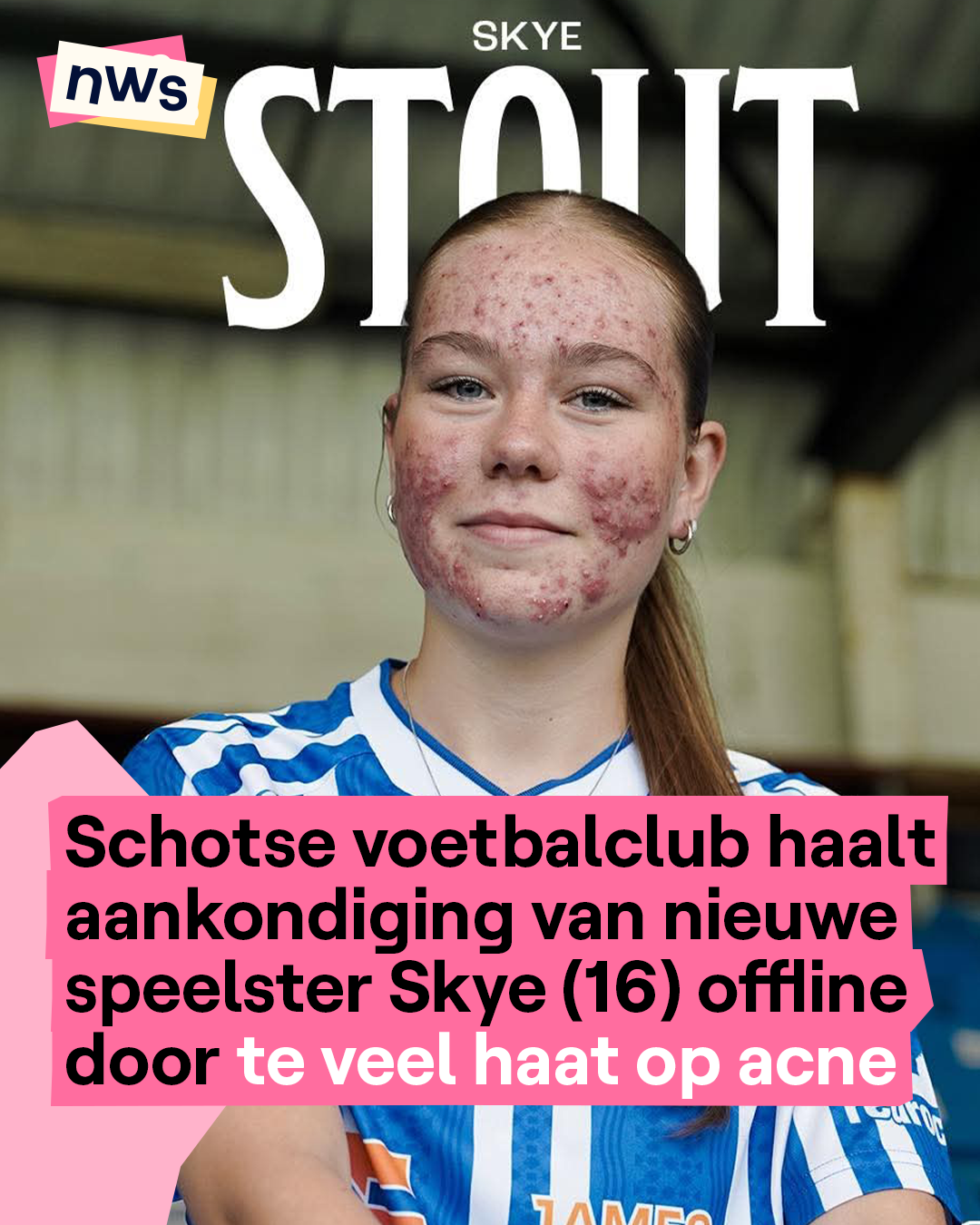 Donderdag tekende de 16-jarige Skye Stout haar eerste profcontract bij het Schotse Kilmarnock. De voetbalclub kondigde Skye aan op hun socials, maar daar kreeg de voetbalster vooral kritiek op haar acne. Dat zijn rode pukkels en puistjes, mee-eters of onderhuidse ontstekingen. Acne komt vooral voor in je puberteit en is erfelijk. Je krijgt het dus niet door je slecht te verzorgen. De voetbalclub heeft door alle haat de post offline gehaald. De foto van Skye gaat nog rond op socials, niet met haatreacties maar met reacties van mensen die haar steunen.