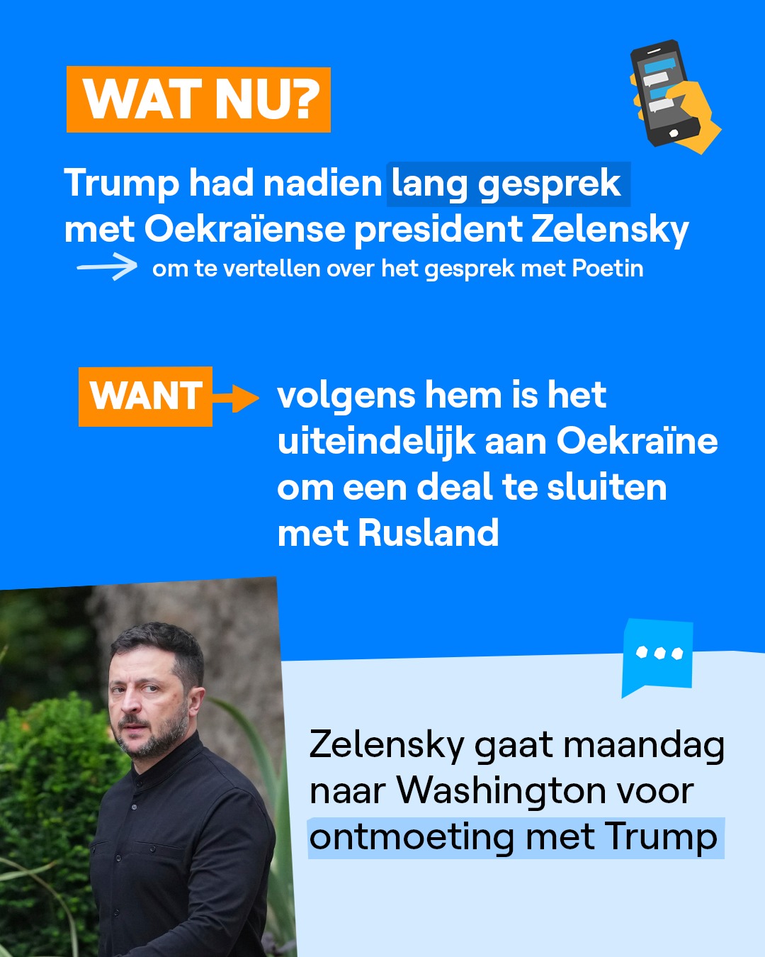 Na het gesprek met Poetin in Alaska, belde Trump anderhalf uur met Zelensky. Hij had ook een gesprek met Europese leiders en de voorzitter van de Europese Commissie Ursula von der Leyen.