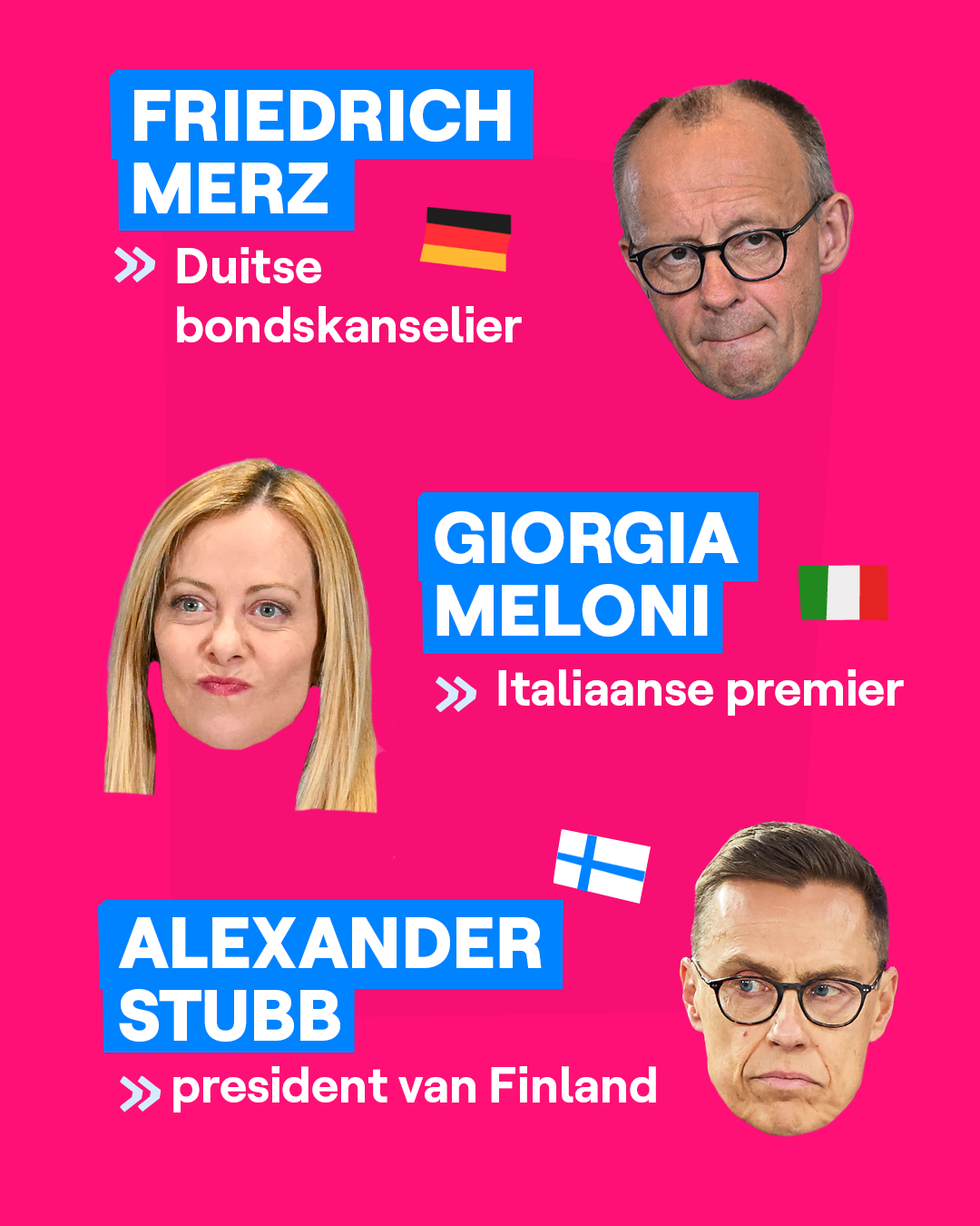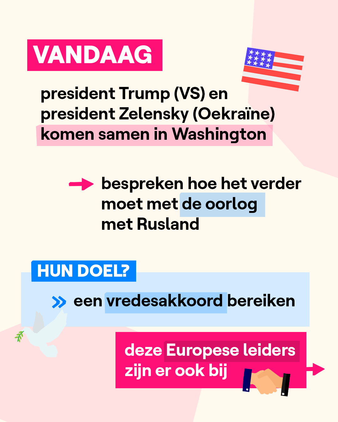 Trump zat afgelopen vrijdag al samen met de Russische president Poetin in Alaska. Wat er toen besproken is, zal vandaag ook aan bod komen. Trump wil nu met Zelensky bekijken hoe het verder moet, in de hoop zo snel mogelijk een vredesakkoord te bereiken. En Zelensky komt niet alleen: verschillende Europese leiders komen mee naar Washington. Swipe om te ontdekken wie er mee is.