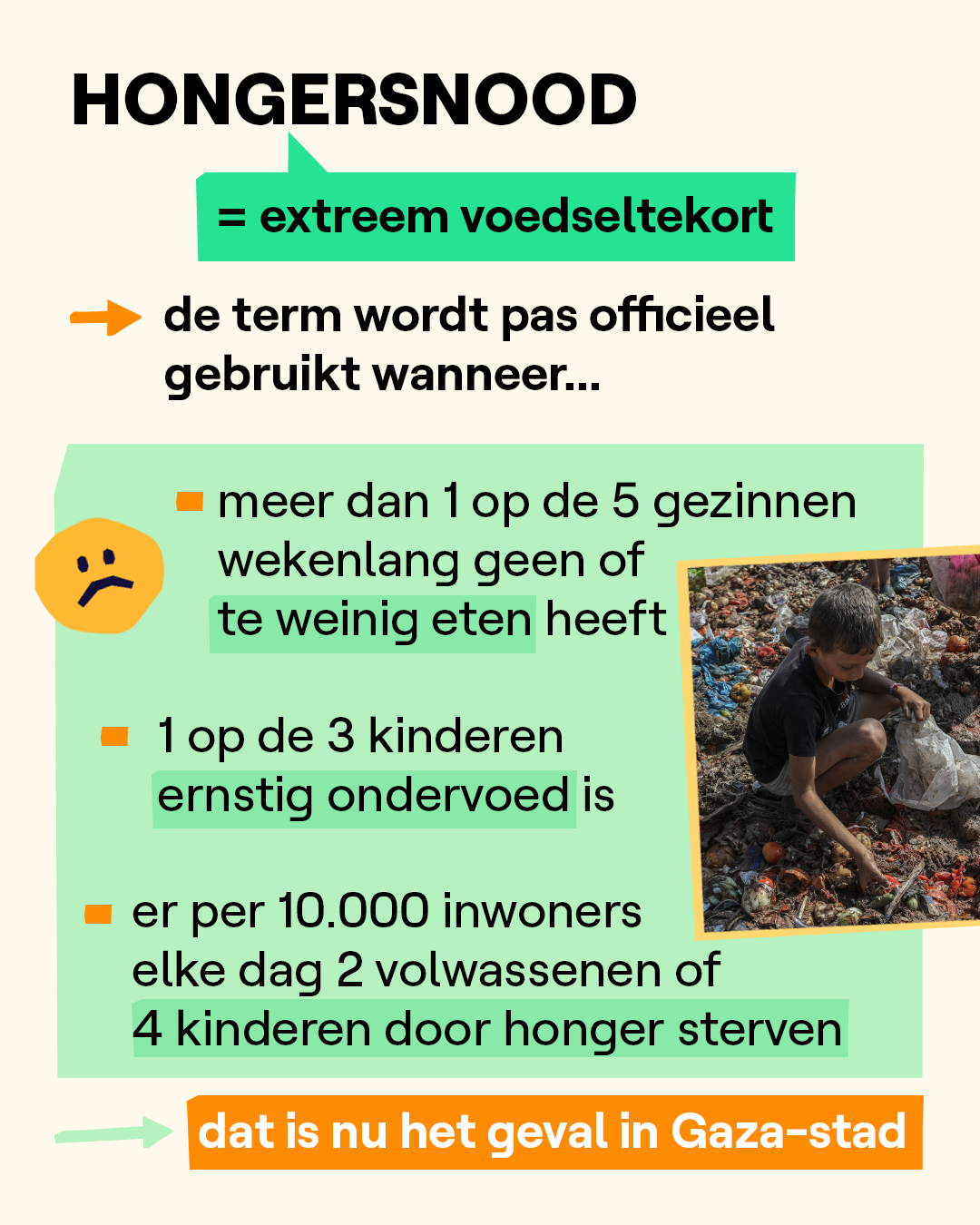 Israël zegt dat er helemaal geen hongersnood is en dat het allemaal leugens zijn die door Hamas verspreid worden. Nochtans is de hongersnood officieel vastgesteld door het team van IPC, een groep van VN-organisaties, ngo’s en lokale autoriteiten. Zij gebruiken daarvoor een internationaal erkende meetmethode (Integrated Food Security Phase Classification).