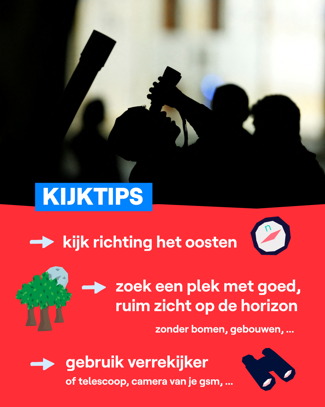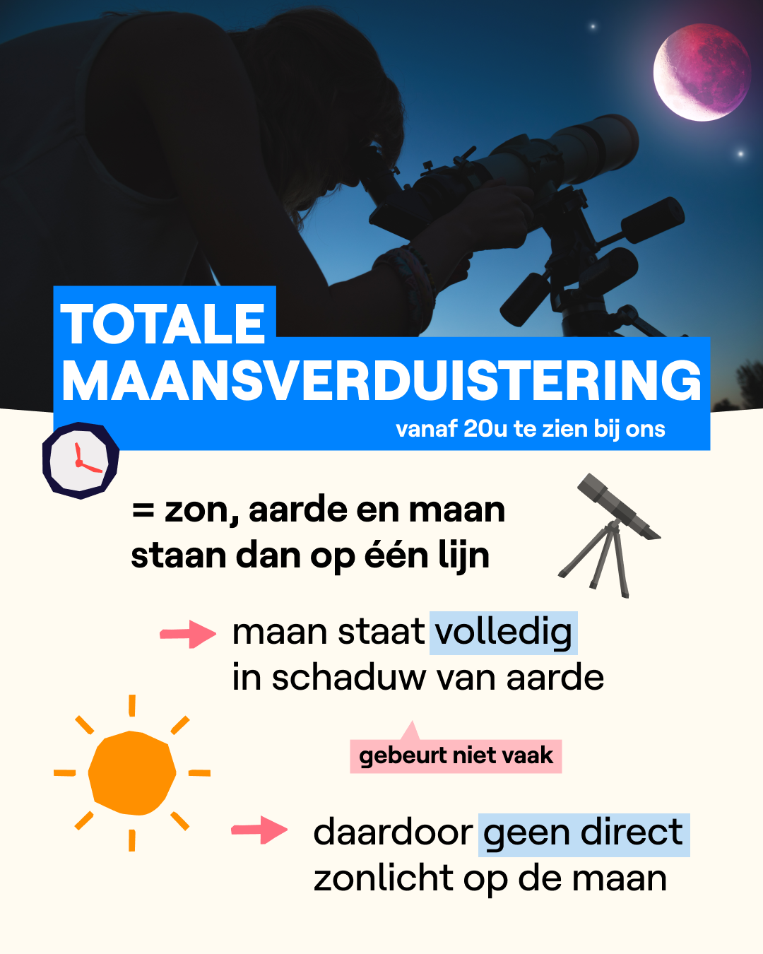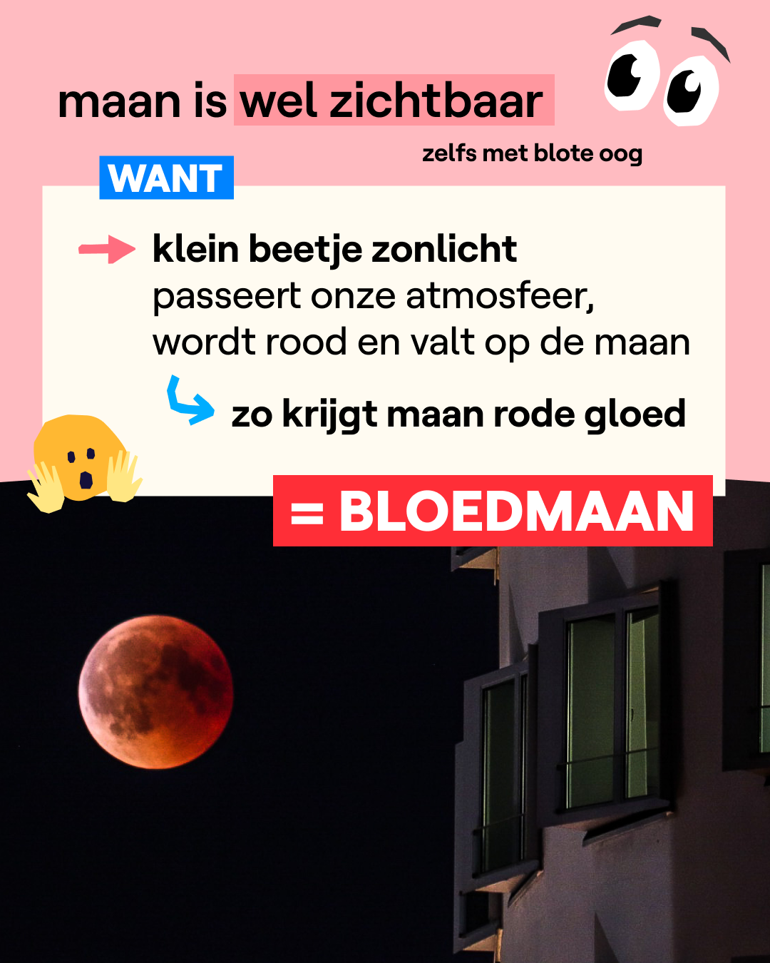 Een zichtbare totale maansverduistering met een bloedmaan is vrij zeldzaam. De volgende valt pas op oudejaarsavond in 2028. Dat komt doordat de maan een beetje schuin rond de aarde draait en meestal niet helemaal in haar schaduw verdwijnt. Maar vanavond dus wel. De maansverduistering begon al om 17u28, maar bij ons zie je het best net als de zon ondergaat (vanaf 20u12). Dan heb je 83 minuten de tijd om de rode maan te spotten. En het beste? Je kan alles gewoon met het blote oog zien. Al levert een goede verrekijker of camera nog betere beelden op.