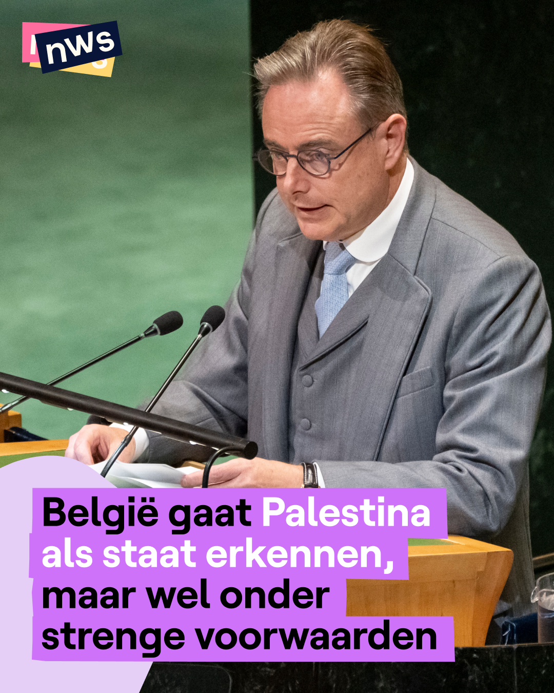 Onze premier Bart De Wever heeft aangekondigd dat ons land klaar is om Palestina als officiële staat te erkennen. Maar dat zal enkel gebeuren onder strenge voorwaarden. Dat zei De Wever tijdens de Algemene Vergadering van de Verenigde Naties in New York. De voorwaarden houden in dat alle gijzelaars eerst vrijgelaten moeten worden én dat Hamas uit het bestuur moet stappen. Pas als deze voorwaarden zijn vervuld, wil België Palestina erkennen. Tijdens de Algemene Vergadering komen staatshoofden en regeringsleiders van over heel de wereld samen om oplossingen te zoeken voor problemen in de wereld. Ook Frankrijk heeft toen beslist om de staat Palestina te erkennen.
