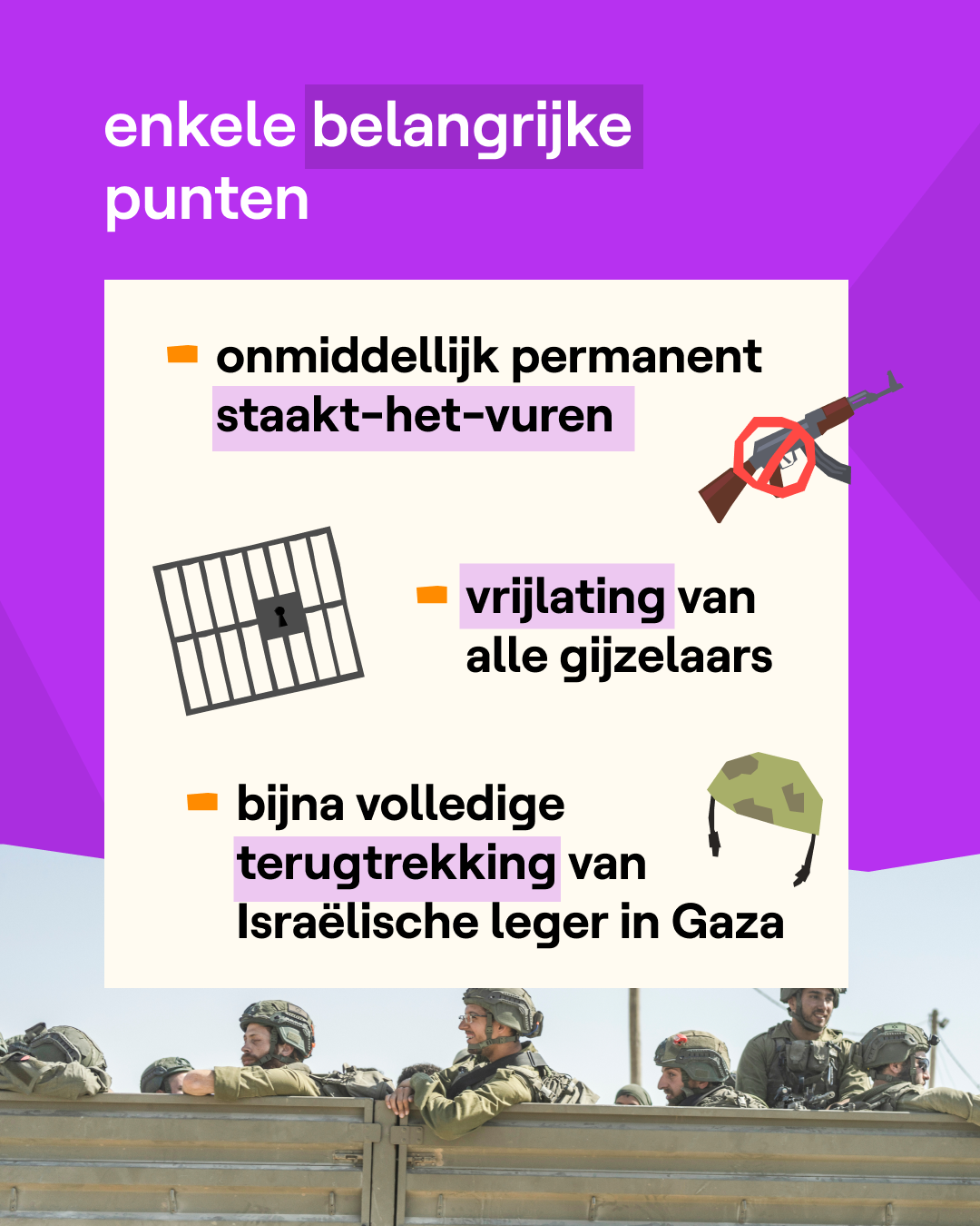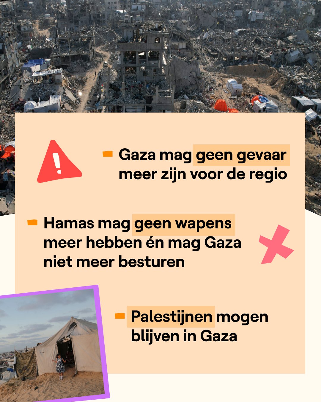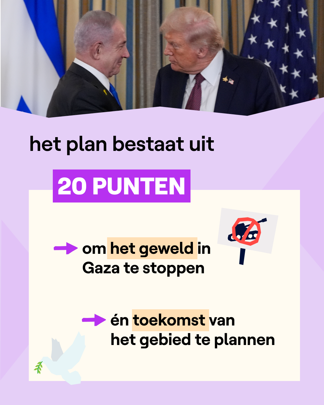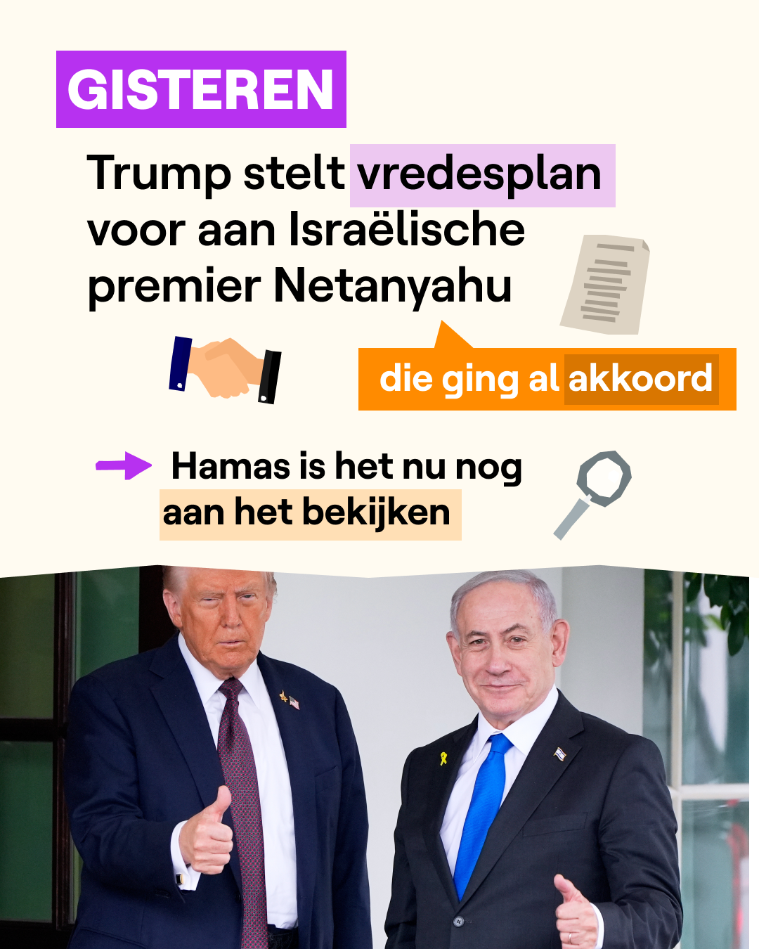 Dit vredesplan komt er nadat Trump vorige week heeft samengezeten met Arabische leiders. Trump wil dat de oorlog eindigt en heeft Netanyahu eigenlijk verplicht om dit plan te aanvaarden, maar Netanyahu zwakt het plan nu al terug af. Hij zegt dat het Israëlische leger niet uit Gaza zal vertrekken, ook al staat dit in het vredesplan. De Israëlische partijen waarmee Netanyahu in een regering zit, willen absoluut geen vrede. Het is dus afwachten hoe zij maar ook Hamas zullen reageren op dit plan. De oorlog in Gaza gaat ondertussen gewoon door.