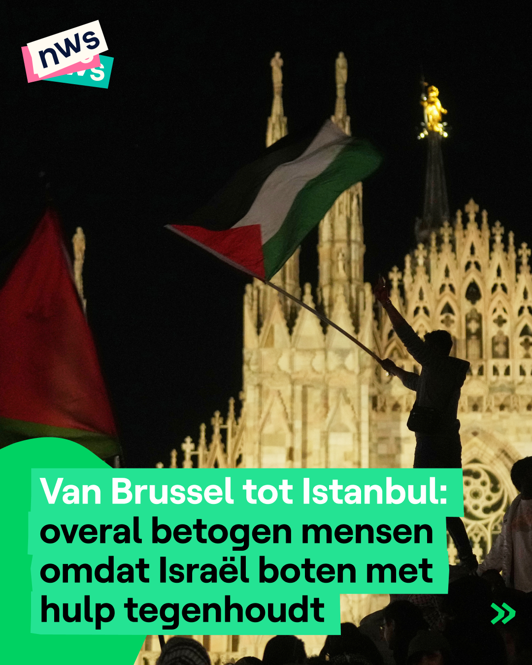 Frankrijk, Nederland, Zwitserland, Italië, Spanje, Ierland en ook bij ons: op verschillende plekken in Europa zijn gisteravond duizenden mensen spontaan op straat gekomen om te protesteren. In Brussel alleen al waren zo'n 4.000 actievoerders. Dat doen ze nadat Israël gisteren meerdere boten met hulpgoederen voor Gaza heeft tegengehouden in internationale wateren. Dat zijn stukken zee die niet bij een land horen en waar iedereen vrij mag rondvaren. Israël pakte daarbij 400 mensen op, waaronder ook 7 Belgen. Op dit moment is er nog 1 schip naar Gaza aan het varen. Swipe om te zien waar er vannacht grote betogingen waren.