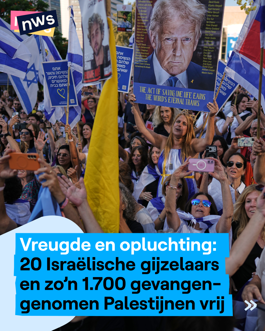 Een groot en belangrijk moment vandaag in Israël. Alle twintig, levende Israëlische gijzelaars zijn zonet vrijgelaten door Hamas. De vrijlating van de gijzelaars gebeurt via het Rode Kruis. Zij checken eerst hun gezondheid en brengen ze erna naar Israël. In ruil voor de gijzelaars laat Israël ook meer dan 1.700 Palestijnse gevangenen vrij. Zij worden met bussen naar de grens van de Gazastrook gebracht. De ruil is een onderdeel van het vredesplan van de Amerikaanse president Donald Trump om het geweld in Gaza te stoppen. Enkele wereldleiders, onder wie Donald Trump, zitten vandaag ook samen in Egypte om verder te babbelen over het einde van de oorlog in Gaza.