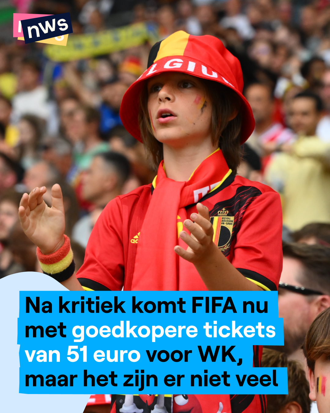 Geen honderden euro’s betalen voor het WK voetbal? Dat kan want Wereldvoetbalbond FIFA komt met goedkopere tickets. Vorige week was er veel kritiek op de zotte prijzen voor het WK. Voor een match in de groepsfase betaal je minimaal 155 euro. Daarom komen er nu ook goedkopere ‘Supporter Entry Tier’-tickets van 51 euro. Toch is er opnieuw kritiek want het gaat om een klein aantal tickets. Bijvoorbeeld het stadion van de match tussen België en Egypte heeft 68.000 plaatsen, maar amper 500 Belgische fans zullen 51 euro betalen voor een stoeltje. De voetbalbonden van de landen die meedoen mogen zelf kiezen welke fans zo’n goedkope tickets mogen kopen. Het WK vindt plaats in juni en juli 2026 in de VS, Canada en Mexico.