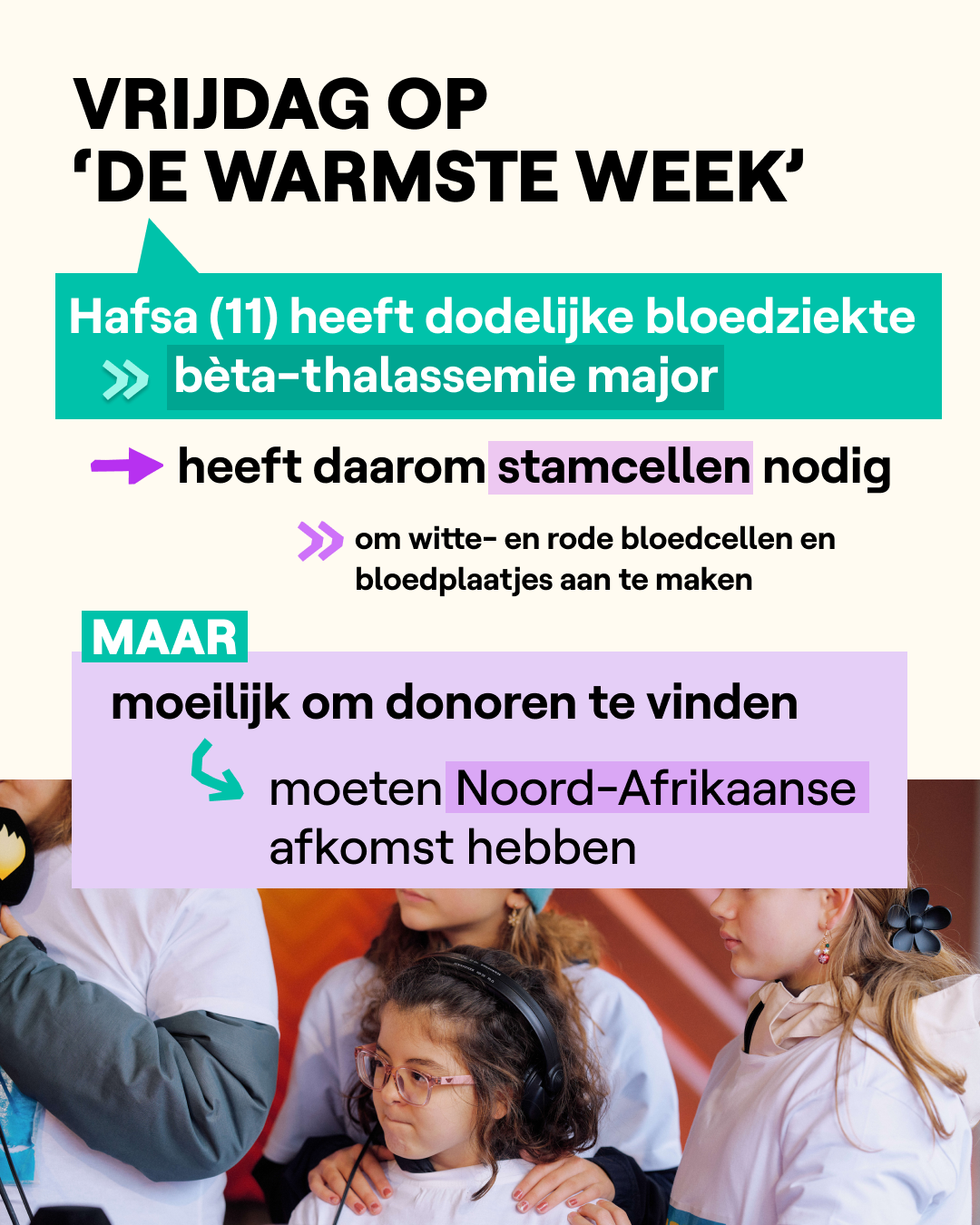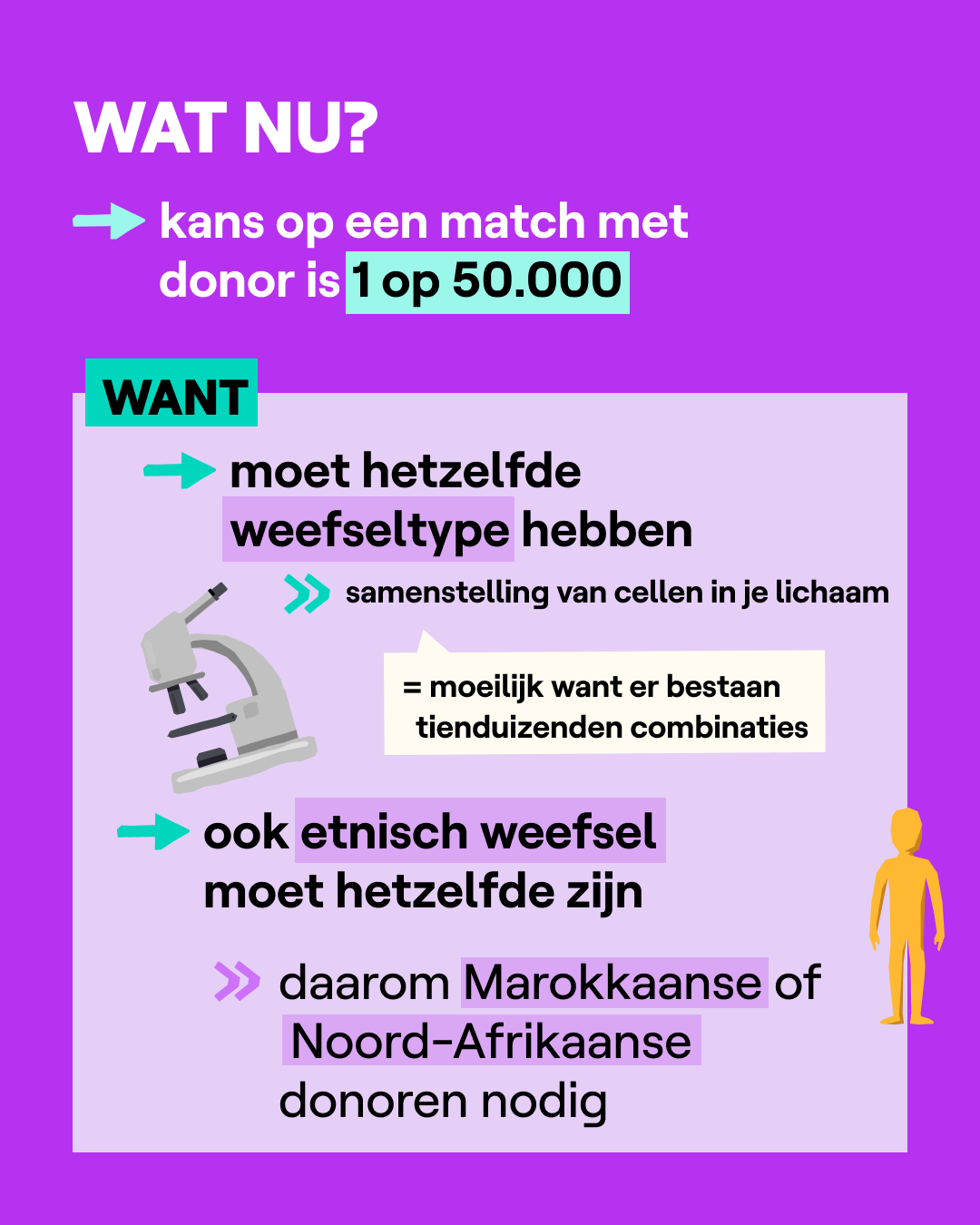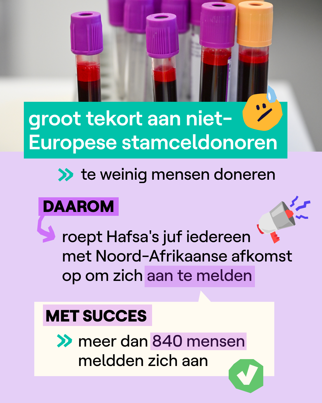 Mensen met een Europese achtergrond hebben 96% kans om een match te vinden met een stamceldonor. Als je een andere etniciteit hebt dan is die kans veel kleiner: 66%. Alle stamceldonoren komen terecht in een wereldwijde databank zodat er over de wereld een match gezocht kan worden. Het Rode Kruis, een hulporganisatie, is al jaren op zoek naar donoren met Afrikaanse, Turkse of gemengde afkomst. Toch zijn die groepen minder goed te bereiken. Gelukkig levert Hafsa's oproep wel extra aanmeldingen op.