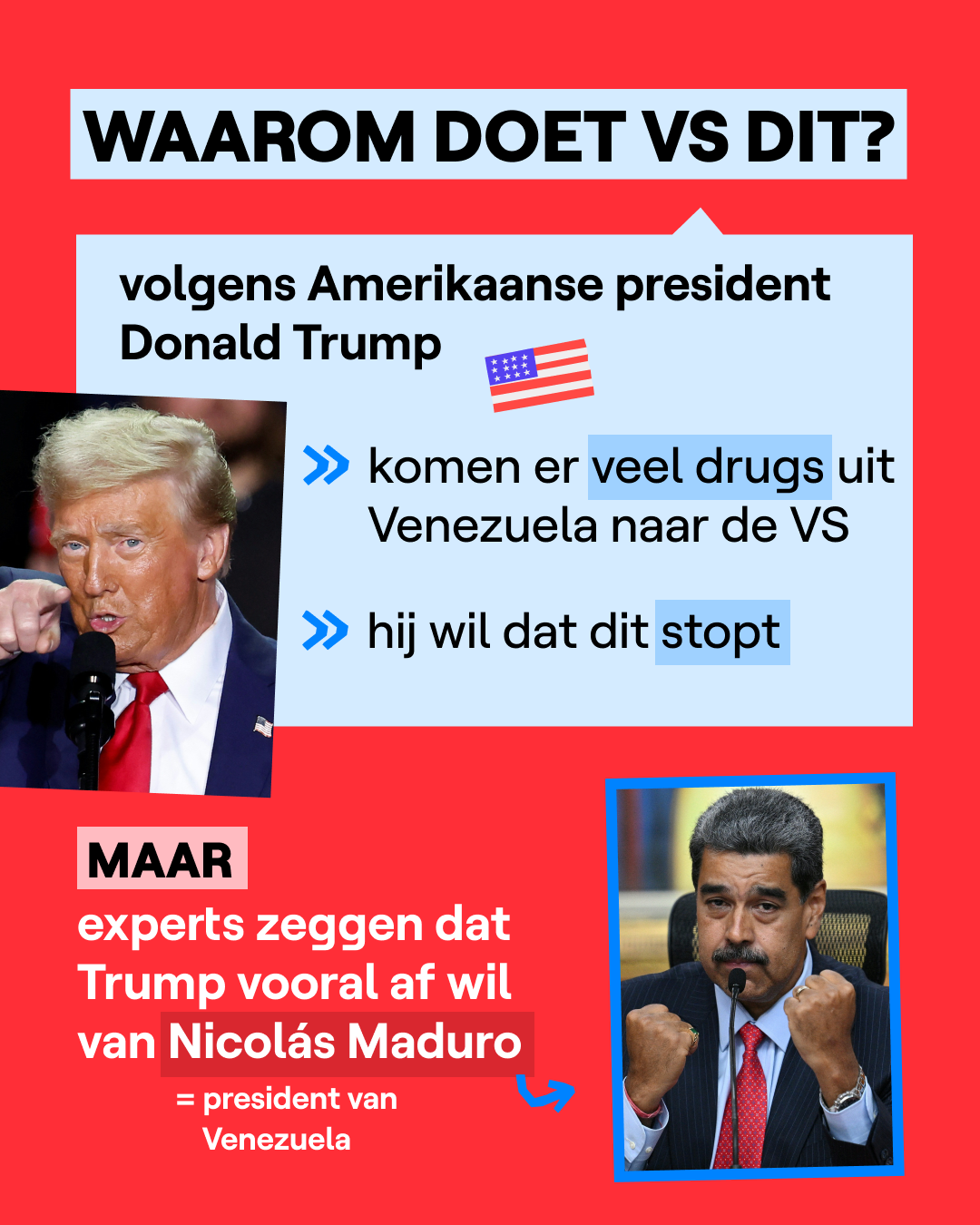 Volgens de Verenigde Staten zou Nicolas Maduro de baas zijn van een drugsnetwerk in Venezuela. Het Amerikaanse leger is al sinds september aanwezig in en rond Venezuela. Voorlopig is het nog niet duidelijk of er slachtoffers zijn gevallen bij de bombardementen. President Donald Trump geeft later vandaag nog een persconferentie over de situatie.