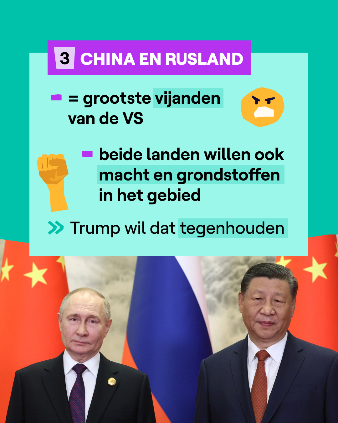 Donald Trump wil niet dat China of Rusland macht krijgen in Groenland. Daarom wil hij dat Groenland onder leiding komt van de VS. NAVO-baas Mark Rutte liet intussen weten dat ze bekijken hoe ze de veiligheidssituatie in Groenland kunnen vergroten en de regio beschermen.