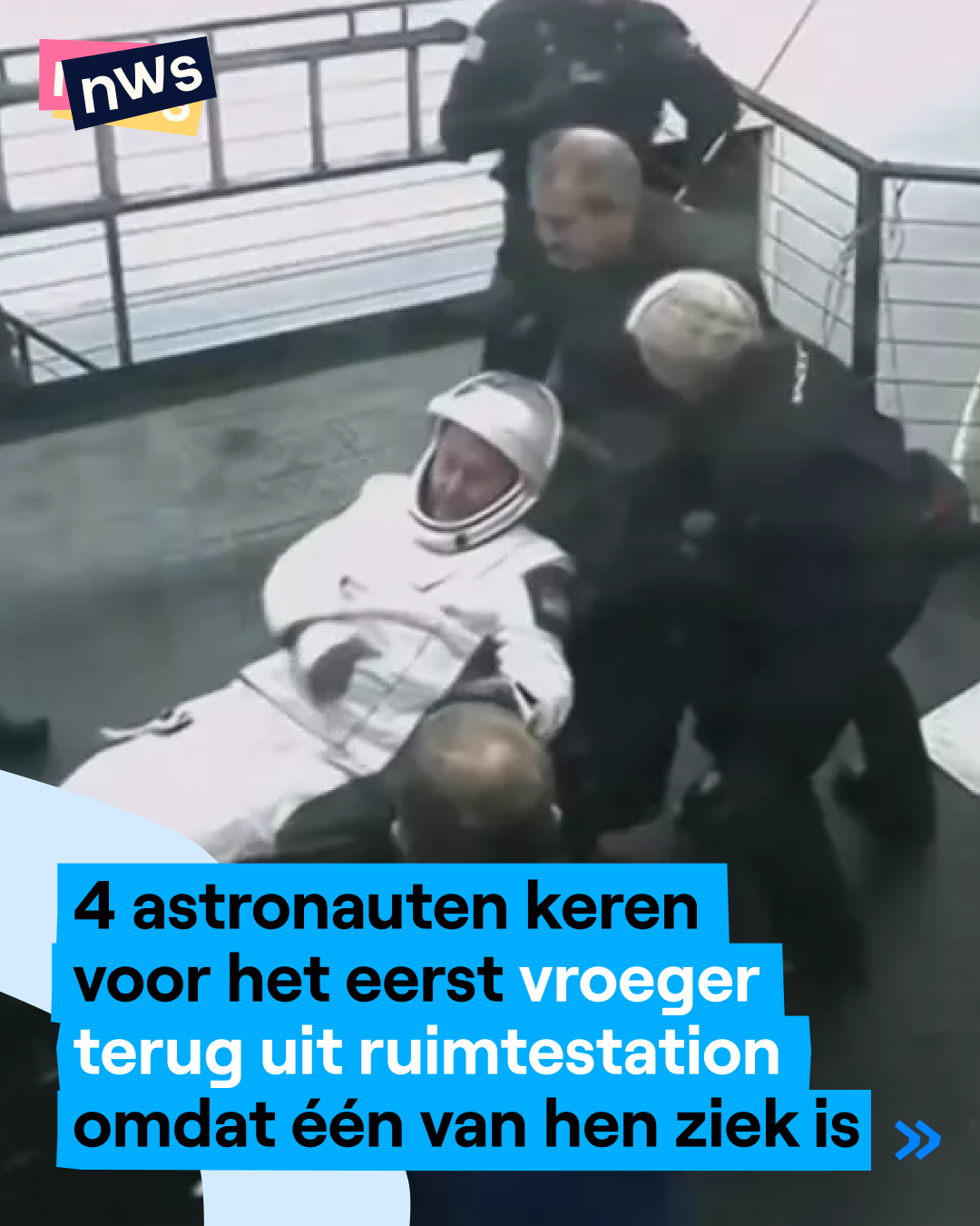 4 astronauten van de Amerikaanse ruimtevaartorganisatie NASA zijn zonet geland op aarde. Ze moesten vroeger dan gepland terugkeren uit het Internationaal Ruimtestation ISS. Het gaat om twee Amerikanen, een Rus en een Japanner. Een van hen heeft een medisch probleem. Die persoon moet daarom verder onderzocht worden en dat kan enkel op aarde. Volgens experts zijn er in de ruimte geen bacteriën dus een griep kan je er niet krijgen. Daarom is de kans groot dat het gaat om een plotse ziekte zoals een blindedarmontsteking, een ongeluk of mentale problemen. Om welke astronaut het gaat en wat er aan de hand is, zegt NASA niet. 't Is de eerste keer dat astronauten vroeger vertrekken uit het ISS door een medisch probleem.