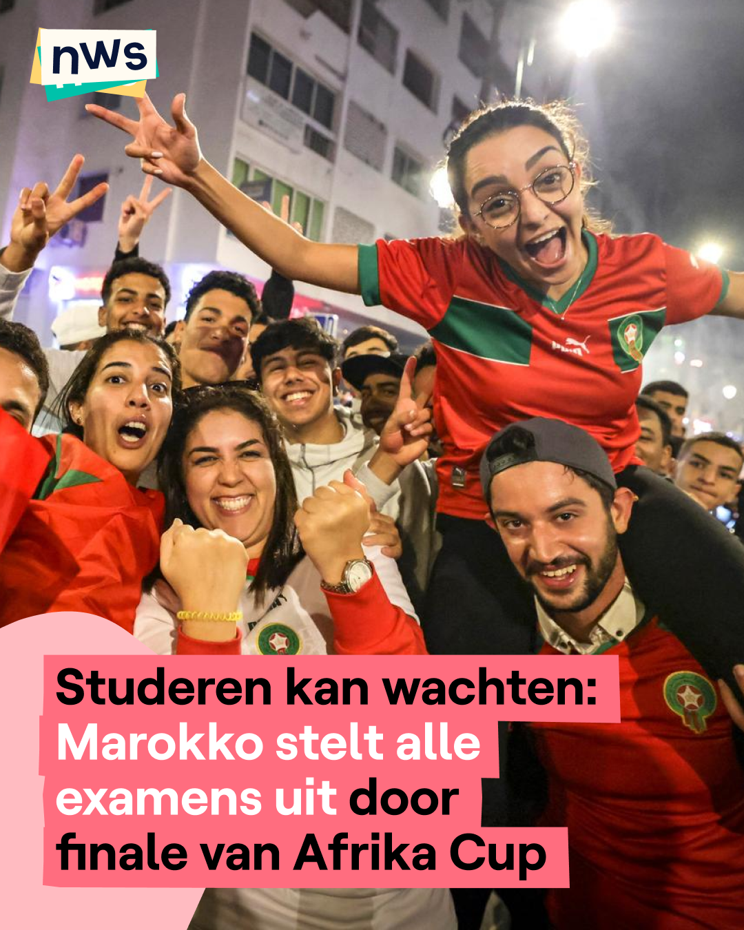 Examenstress maakt even plaats voor voetbalstress in Marokko. Daar heeft de overheid beslist om alle examens een paar dagen uit te stellen, zodat studenten de finale van de Afrika Cup niet moeten missen. Dat is een voetbalcompetitie tussen 24 Afrikaanse landen. Dit jaar gaat het door in Marokko. Vanavond nemen de ploegen Marokko en Senegal het tegen elkaar op in de finale en weten we eindelijk wie de beker mee naar huis zal nemen. Wie zal er winnen?