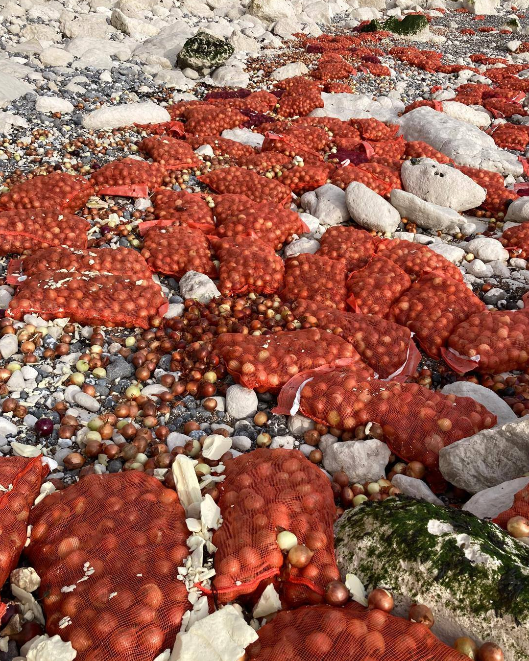Geen zand op dit strand in Sussex (Engeland), maar... frietjes en ajuinen! Het eten zat in een container op een schip, maar die container kwam per ongeluk in de zee terecht. De laatste tijd spoelden er al meerdere etenswaren aan in Engeland, zoals bananen, uien en blikken. Bewoners in de buurt komen nu samen om het strand op te kuisen.