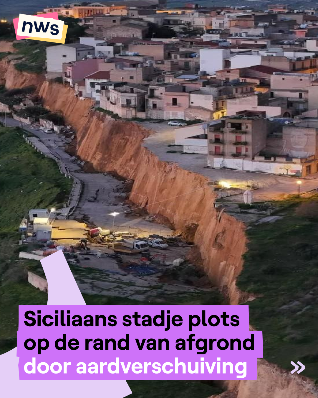 Op het Italiaans eiland Sicilië is er een enorme aardverschuiving ontstaan door een storm. Daarbij stortte een klif in over een afstand van 4 kilometer. Gelukkig zijn er geen slachtoffers gevallen. Sommige huizen van het stadje Niscemi staan nu wel echt aan de afgrond. De situatie blijft dus gevaarlijk en zo'n duizend inwoners zijn geëvacueerd.
