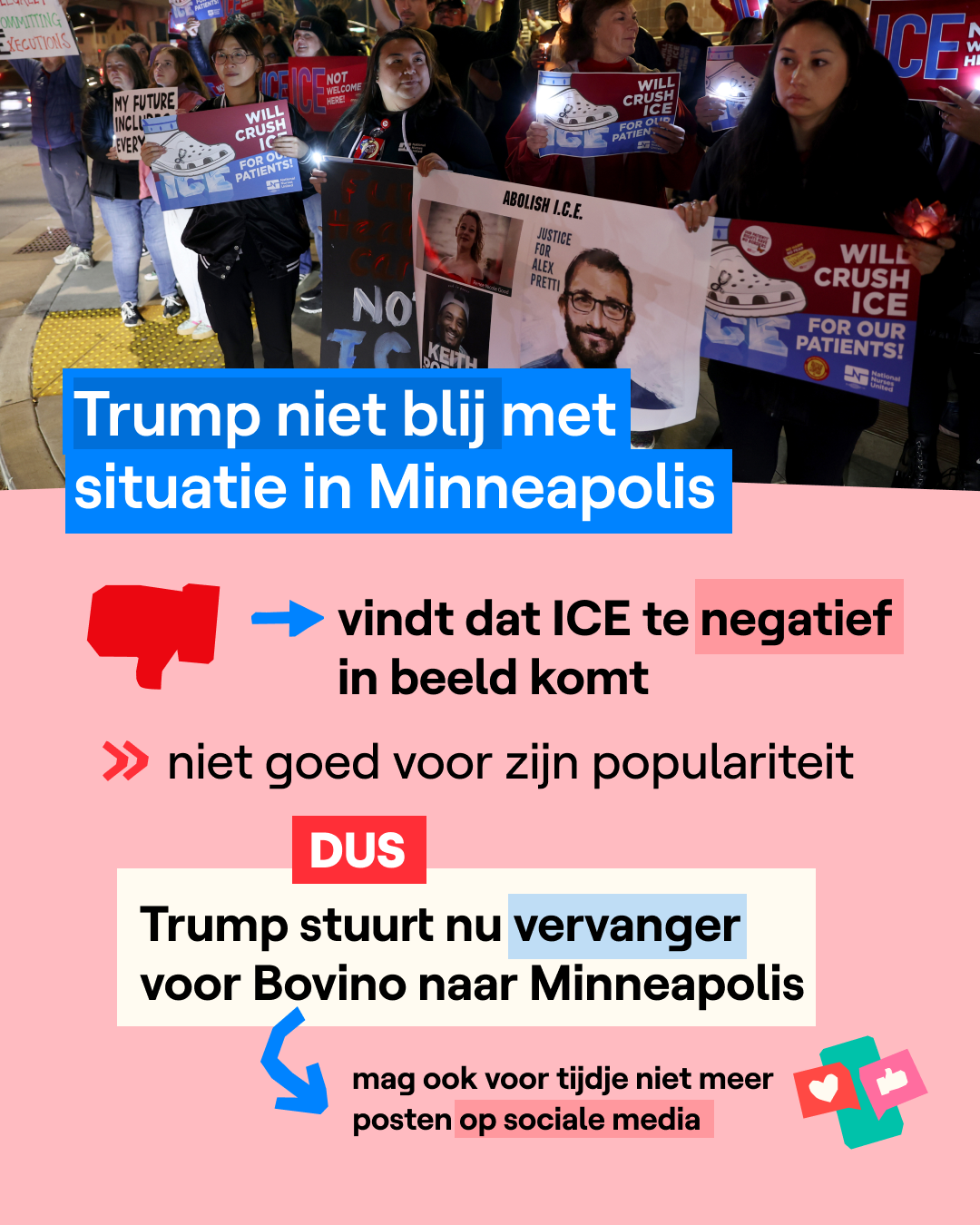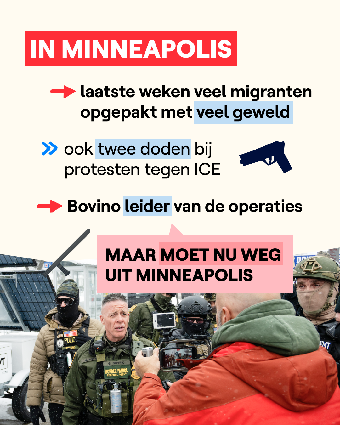 Greg Bovino zal in Minneapolis vervangen worden door Tom Homan. Die man krijgt de bijnaam ‘grens-tsaar’, omdat hij de Amerikaanse grenzen superstreng wil bewaken. In Minneapolis zijn er momenteel nog 3.000 agenten van ICE en de grenspolitie aanwezig. Het wordt afwachten of zij met veel geweld migranten zullen blijven oppakken.