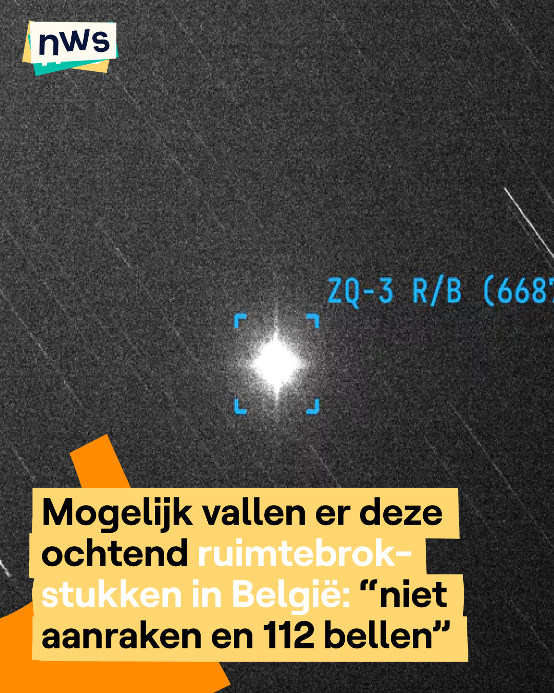 Ons land heeft een waarschuwing gekregen van het Europees systeem voor de bewaking en opvolging van objecten in de ruimte. Er zouden deze ochtend, rond 9u50, brokstukken van een raket in ons land kunnen belanden. Het gebied waarin de stukken terecht kunnen komen, is nog heel groot dus veel zekerheid is er niet. Het gaat om delen van een raket die uiteen is gevallen. Over de grootte van de stukken is er nog geen info maar experts volgen de situatie op. Zij vragen ook om meteen 112 te bellen als je iets ziet en zeker geen brokstukken aan te raken want dat kan gevaarlijk zijn.