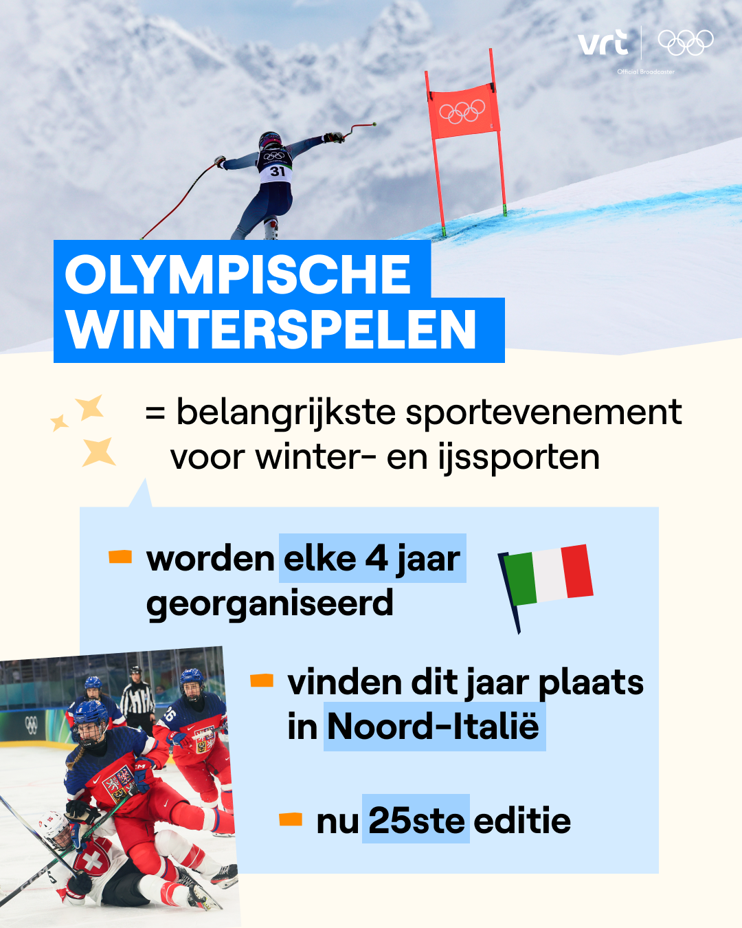 De wedstrijden vinden plaats op verschillende locaties in Noord-Italië. Onder andere in Milaan en in Cortina d'Ampezzo, dat is een heel klein dorpje in de bergketen de Dolomieten. De Winterspelen duren tot 22 februari.