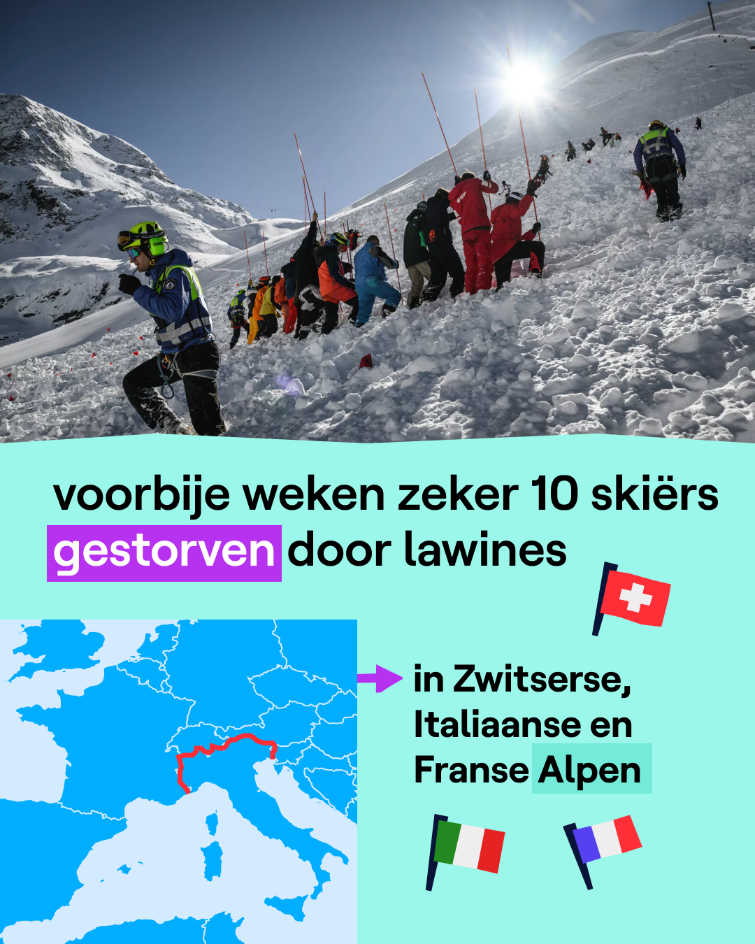 De afgelopen dagen waren er veel dodelijke lawines in de Alpen. Zo kwamen in Frankrijk, Italië en Zwitserland meerdere mensen om het leven. De lawines veroorzaken ook zware ongevallen en gewonden. Omdat het zoveel gesneeuwd heeft, is het lawinegevaar nu op veel plekken extreem hoog.