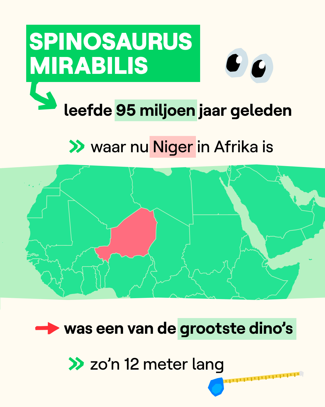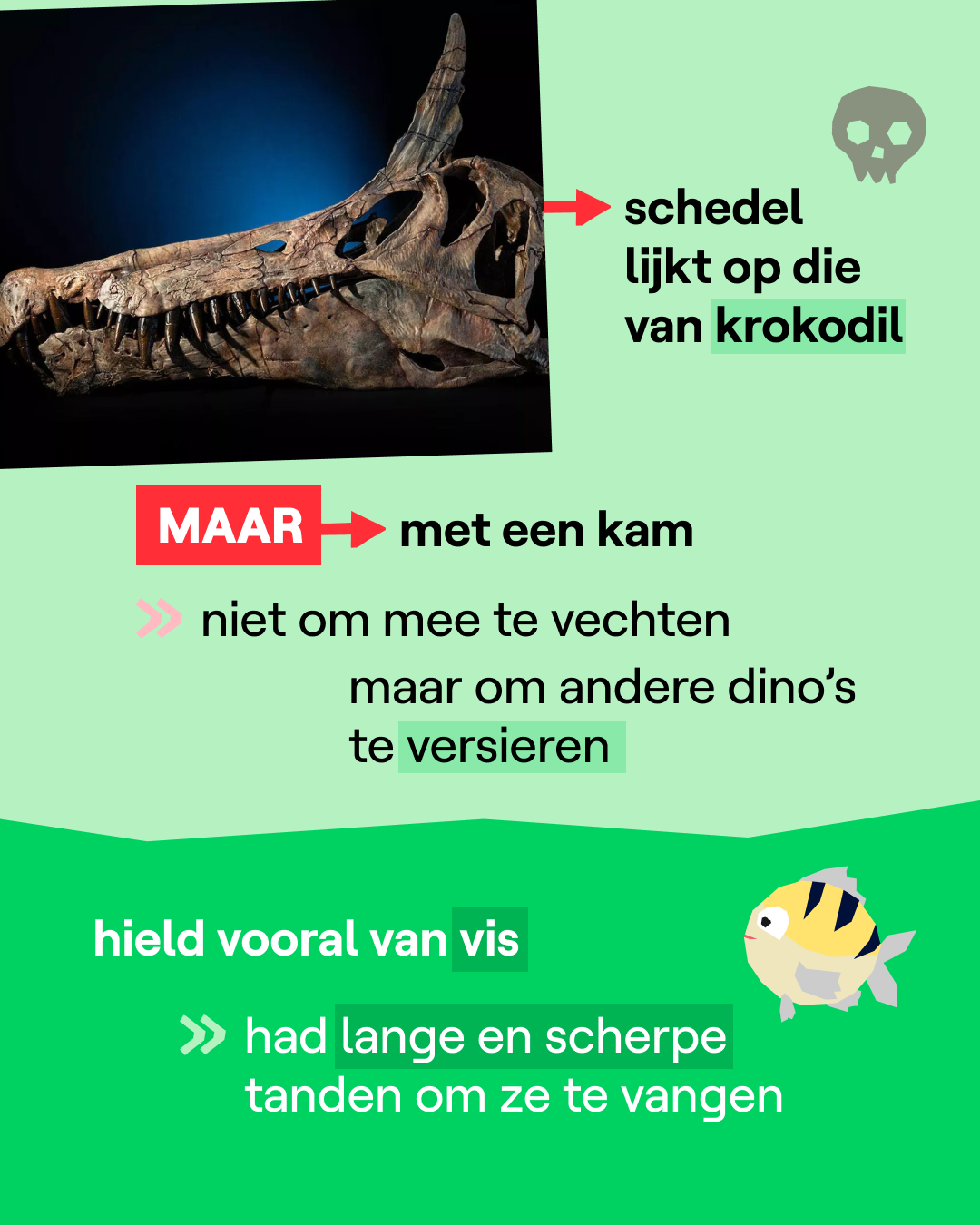 De beenderen van de dinosaurus werden gevonden op een afgelegen plek in de Sahara. Dat is de grootste woestijn ter wereld. Alleen zag die plek er 95 miljoen jaar geleden helemaal anders uit. De zeespiegel stond toen een pak hoger. Daardoor waren er veel ondiepe zeeën, ook daar. Ideaal dus voor de dino om elke dag op zoek te gaan naar zijn lievelingseten: verse vis!