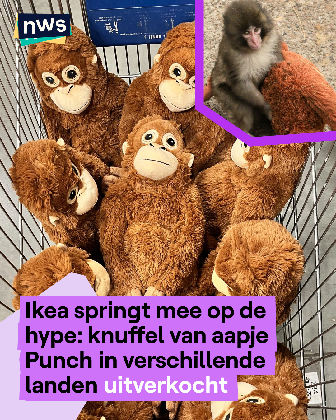 Heb jij hem al gespot? Deze knuffelaap van Ikea is ineens superpopulair. En dat komt allemaal door het aapje Punch, een zes maanden oude makaak uit een dierentuin in Japan. Hij werd vlak na zijn geboorte achtergelaten door zijn moeder. Als vervanger kreeg hij toen een knuffelaap van Ikea en sindsdien laat hij die niet meer los. Op het internet is hij daardoor een echte beroemdheid geworden. Over heel de wereld maakt de meubelwinkel Ikea reclame over de knuffel waarin ze verwijzen naar Punch. En dat werkt supergoed, want in verschillende landen zoals de VS, Japan en Noord-Korea is de knuffel helemaal uitverkocht. Zelfs de president van Japan kwam al op bezoek in de dierentuin. Punch kreeg toen nóg meer Ikea-knuffels als cadeau.