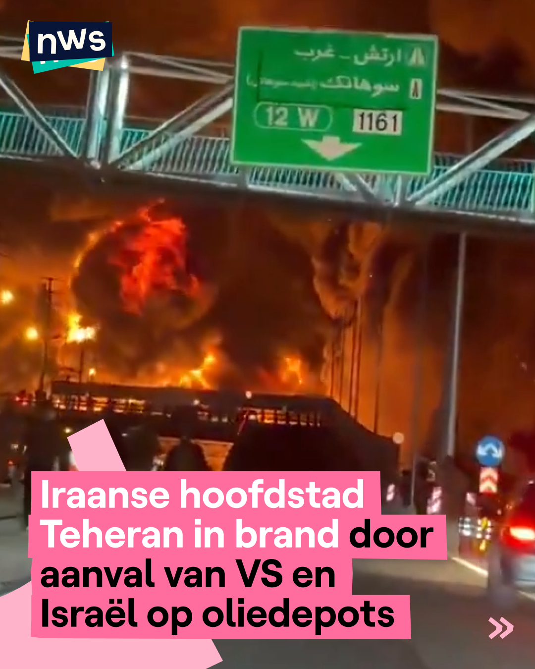 De Iraanse hoofdstad Teheran stond vannacht in vuur en vlam. Dat komt door een aanval van de VS en Israël op Iraanse oliedepots. Dat zijn grote opslagplaatsen waar olie wordt bewaard voordat het wordt vervoerd. Er lekte ook verbrande olie naar de riolen. Zo kwamen sommige straten helemaal in brand te staan. Volgens Iran zouden er bij de aanval 4 mensen zijn gedood. Ondertussen is de brand onder controle. Swipe voor beelden van de vlammen in Teheran.