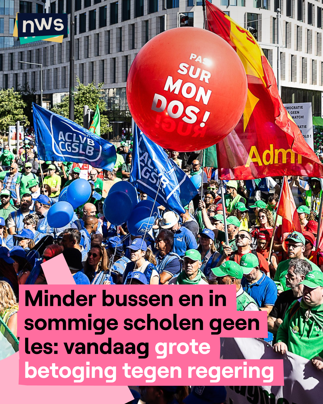 Vandaag is er een grote nationale betoging. Heel wat mensen komen samen in Brussel om te tonen dat ze het niets eens zijn met de plannen van de van de Belgische regering. Vooral over de pensioenplannen zijn ze het niet eens. Volgens hen zullen ze langer moeten werken en worden vrouwen zelfs extra hard getroffen. Er worden vandaag ongeveer 80.000 betogers verwacht. Daardoor zullen er in het hele land problemen zijn, vooral bij de bussen en trams. Ongeveer 4 op de 10 ritten zullen niet rijden. Ook op de luchthavens van Zaventem en Charleroi vertrekt vandaag geen enkele vlucht. Op sommige scholen is er vandaag geen of minder les omdat leerkrachten mee betogen.