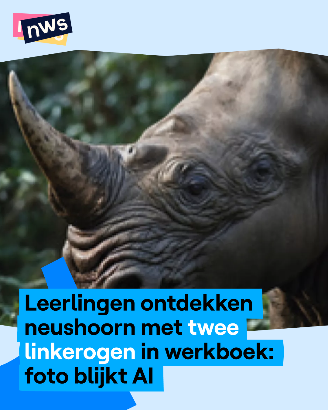 In een aardrijkskundeboek hebben leerlingen uit Boechout een opvallende fout ontdekt: een neushoorn met twee linkerogen. De afbeelding blijkt gemaakt met AI. De uitgeverij kocht de foto op een beeldbank, zonder te weten dat de foto niet echt is. AI gebruiken in schoolboeken mag volgens Europese regels, maar dan moet het wel vermeld worden. De uitgever heeft de foto intussen al aangepast in het online werkboek en belooft strenger te controleren in de toekomst.